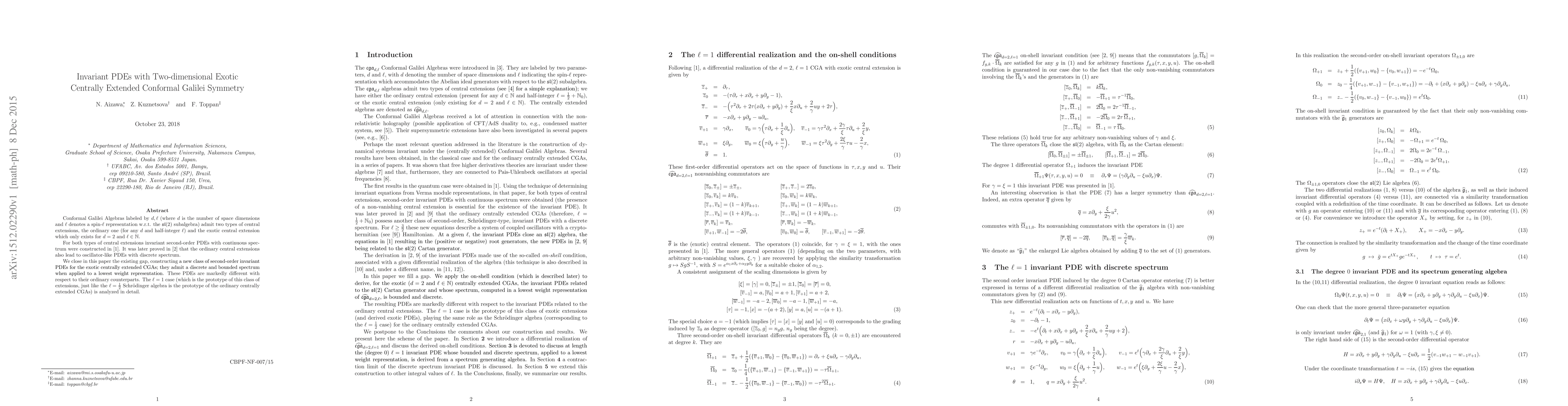 This paper constructs a new class of second-order invariant partial differential equations (PDEs) associated with exotic centrally extended conformal Galilei algebras in two dimensions. Unlike their ordinary counterparts, these new PDEs exhibit a discrete and bounded spectrum when applied to a lowest weight representation.
