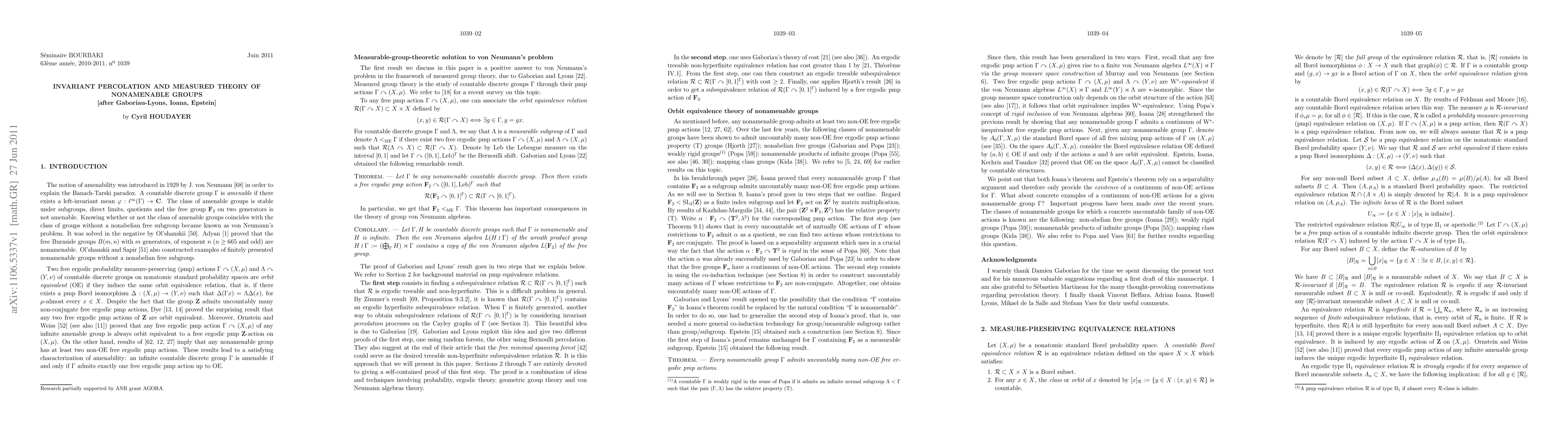 Using percolation techniques, Gaboriau and Lyons recently proved that every countable, discrete, nonamenable group $\Gamma$ contains measurably the free group $\mathbf F_2$ on two generators: there exists a probability measure-preserving, essentially free, ergodic action of $\mathbf F_2$ on $([0, 1]^\Gamma, \lambda^\Gamma)$ such that almost every $\Gamma$-orbit of the Bernoulli shift splits into $\mathbf F_2$-orbits. A combination of this result and works of Ioana and Epstein shows that every countable, discrete, nonamenable group admits uncountably many non-orbit equivalent actions.