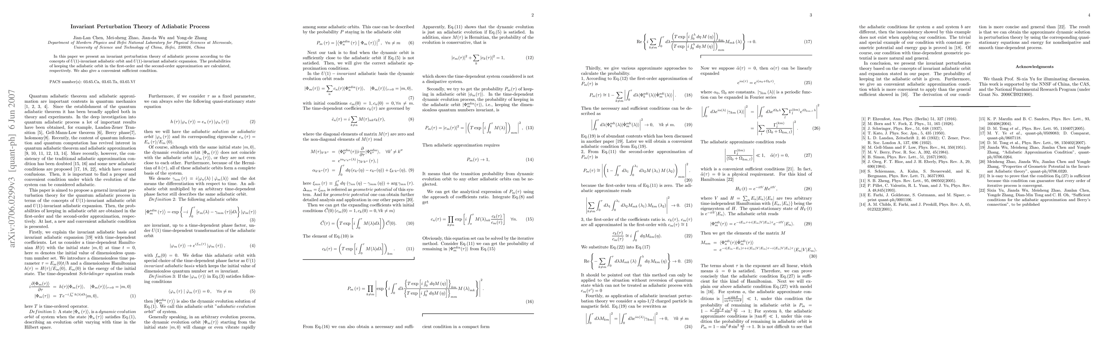 In this paper we present an invariant perturbation theory to adiabatic process according to the concepts of adiabatic orbits, adiabatic evolution orbit and U(1)-invariant adiabatic orbit. The probabilities of keeping the adiabatic orbit in the first-order and the second-order approximation are calculated, respectively. We also give a convenient sufficient condition.