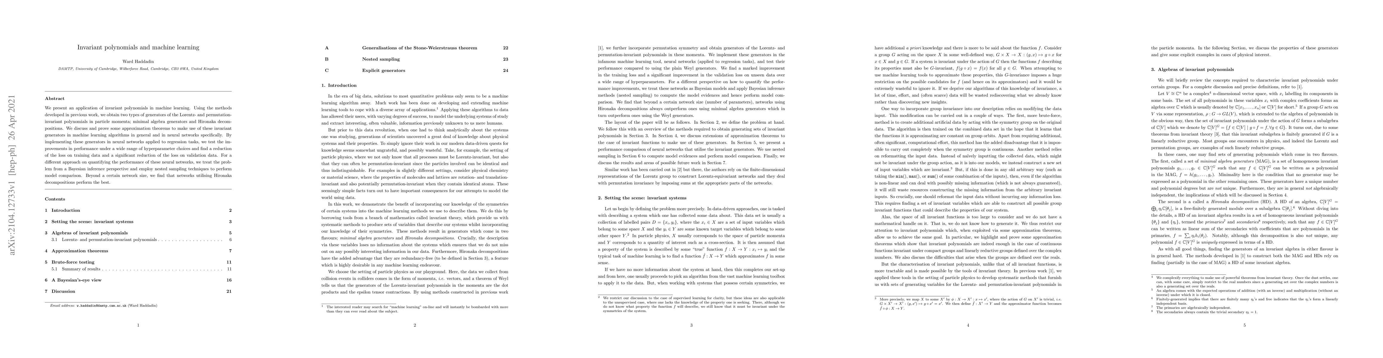 We present an application of invariant polynomials in machine learning. Using the methods developed in previous work, we obtain two types of generators of the Lorentz- and permutation-invariant polynomials in particle momenta; minimal algebra generators and Hironaka decompositions. We discuss and prove some approximation theorems to make use of these invariant generators in machine learning algorithms in general and in neural networks specifically. By implementing these generators in neural networks applied to regression tasks, we test the improvements in performance under a wide range of hyperparameter choices and find a reduction of the loss on training data and a significant reduction of the loss on validation data. For a different approach on quantifying the performance of these neural networks, we treat the problem from a Bayesian inference perspective and employ nested sampling techniques to perform model comparison. Beyond a certain network size, we find that networks utilising Hironaka decompositions perform the best.
