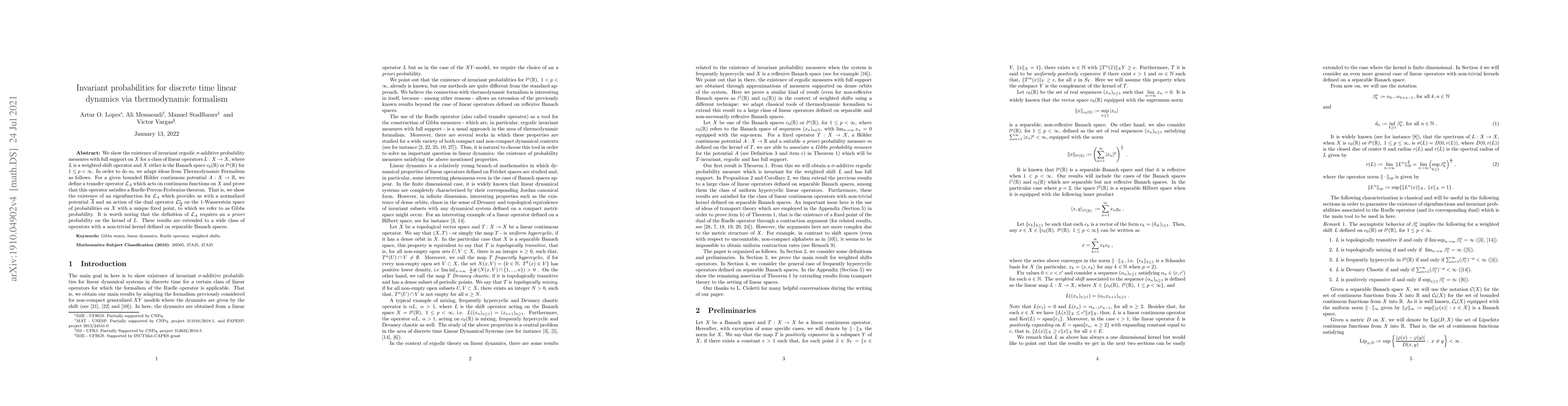 Researchers prove the existence of invariant probability measures for discrete time linear dynamics using Thermodynamic Formalism, showing a connection between linear operators and Gibbs probabilities on separable Banach spaces.