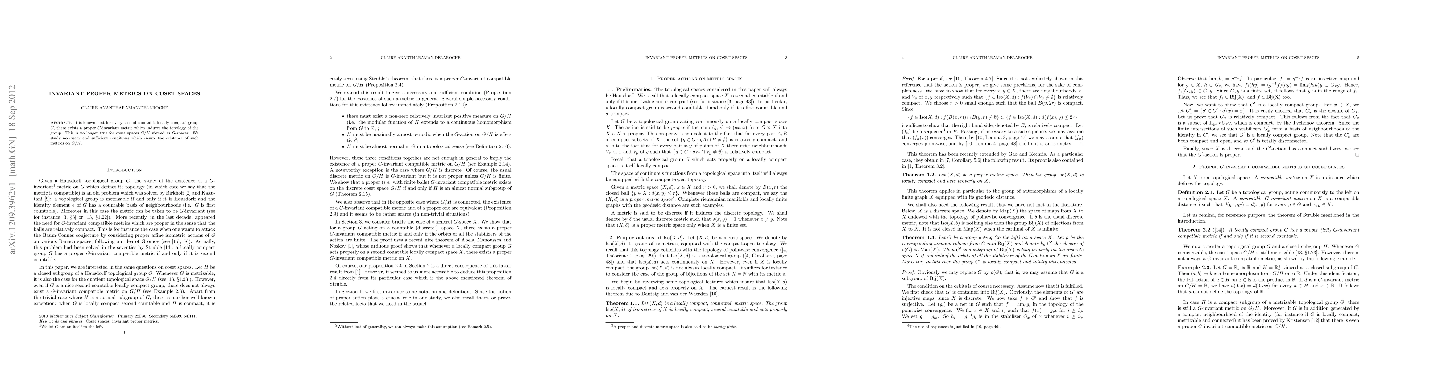 This paper explores the existence of proper G-invariant metrics on coset spaces G/H that induce the topology of G/H, identifying necessary and sufficient conditions for such metrics to exist.