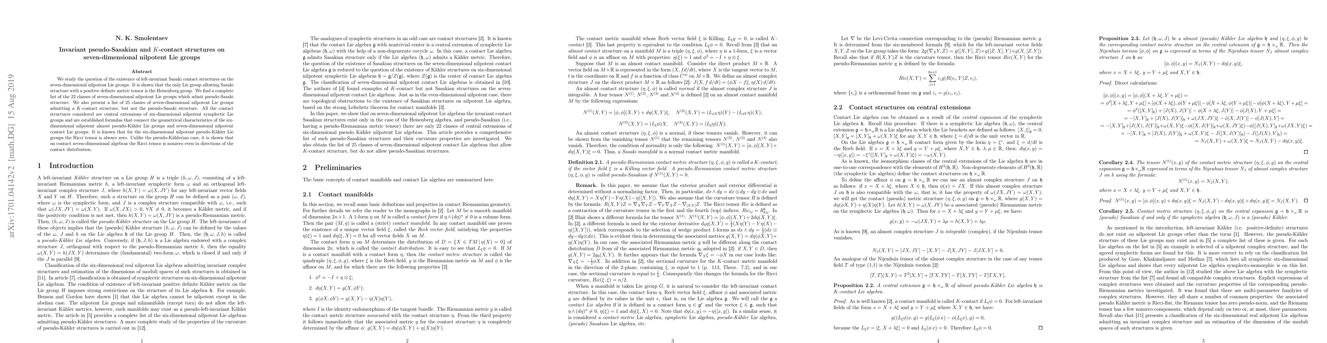 We study the question of the existence of left-invariant Sasaki contact structures on the seven-dimensional nilpotent Lie groups. It is shown that the only Lie group allowing Sasaki structure with a positive definite metric tensor is the Heisenberg group. We find a complete list of the 22 classes of seven-dimensional nilpotent Lie groups which admit pseudo-Sasaki structure. We also present a list of 25 classes of seven-dimensional nilpotent Lie groups admitting a $K$-contact structure, but not the pseudo-Sasaki structure. All the contact structures considered are central extensions of six-dimensional nilpotent symplectic Lie groups and are established formulas that connect the geometrical characteristics of the six-dimensional nilpotent almost pseudo-K\"{a}hler Lie groups and seven-dimensional nilpotent contact Lie groups. It is known that for the six-dimensional nilpotent pseudo-K\"{a}hler Lie groups the Ricci tensor is always zero. Unlike the pseudo-K\"{a}hlerian case, it is shown that on contact seven-dimensional algebras the Ricci tensor is nonzero even in directions of the contact distribution.
