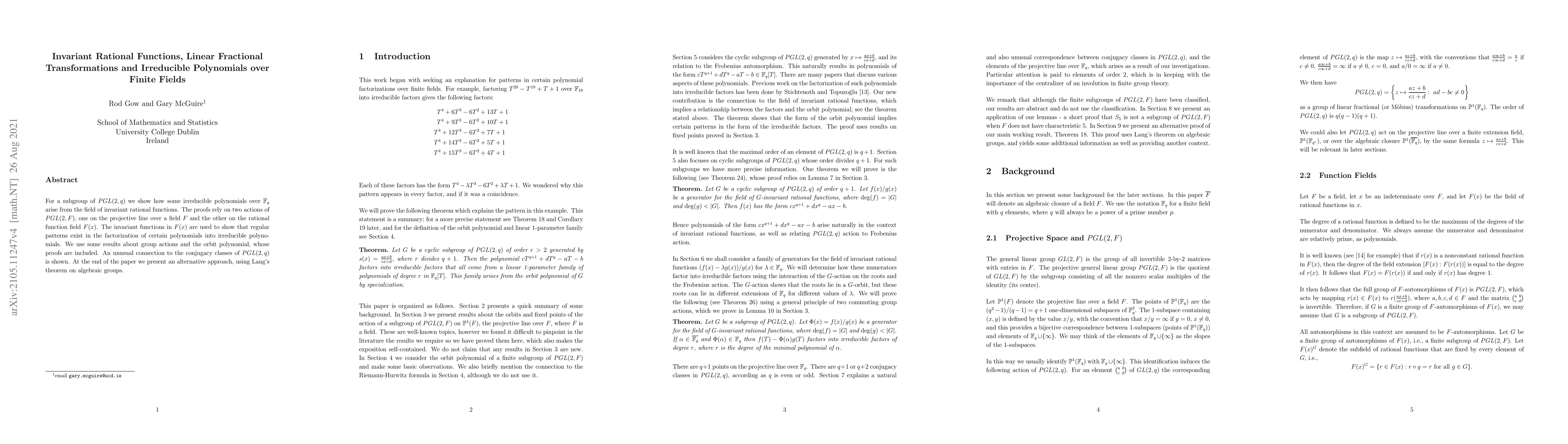 Summary: This paper demonstrates how certain irreducible polynomials over finite fields emerge from invariant rational functions, utilizing group actions of $PGL(2,q)$ on both projective lines and rational function fields. It reveals patterns in polynomial factorization and connects these findings to conjugacy classes within $PGL(2,q)$, ultimately presenting an alternative proof using Lang's theorem on algebraic groups.