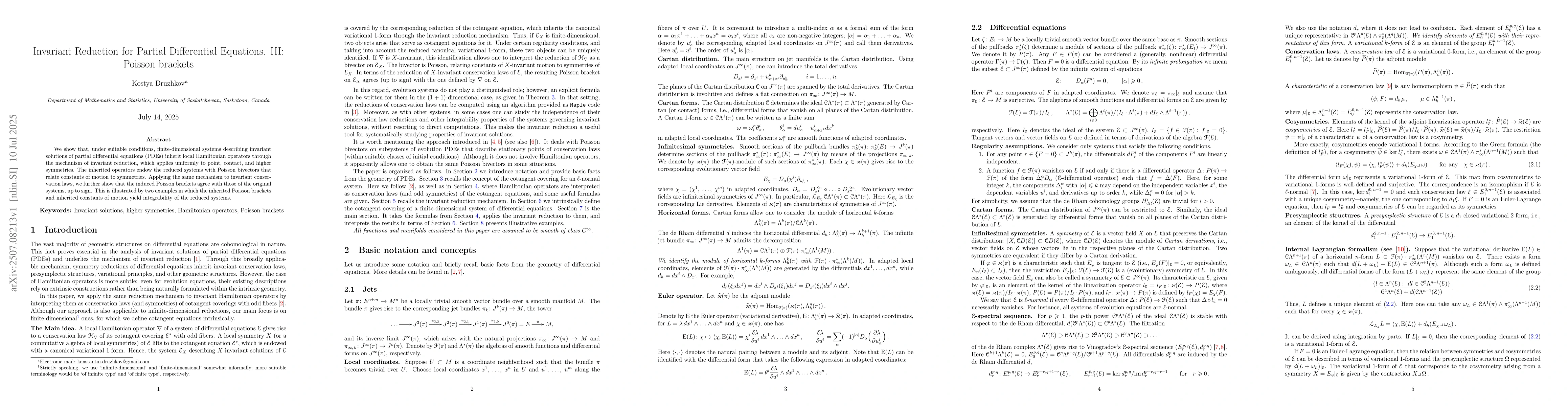 We show that, under suitable conditions, finite-dimensional systems describing invariant solutions of partial differential equations (PDEs) inherit local Hamiltonian operators through the mechanism of invariant reduction, which applies uniformly to point, contact, and higher symmetries. The inherited operators endow the reduced systems with Poisson bivectors that relate constants of motion to symmetries. Applying the same mechanism to invariant conservation laws, we further show that the induced Poisson brackets agree with those of the original systems, up to sign. This is illustrated by two examples in which the inherited Poisson brackets and inherited constants of motion yield integrability of the reduced systems.