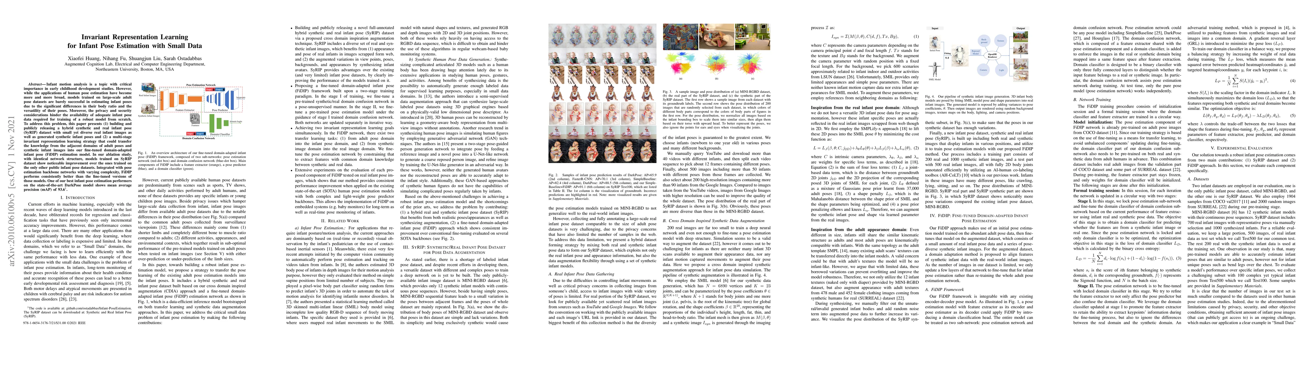 Infant motion analysis is a topic with critical importance in early childhood development studies. However, while the applications of human pose estimation have become more and more broad, models trained on large-scale adult pose datasets are barely successful in estimating infant poses due to the significant differences in their body ratio and the versatility of their poses. Moreover, the privacy and security considerations hinder the availability of adequate infant pose data required for training of a robust model from scratch. To address this problem, this paper presents (1) building and publicly releasing a hybrid synthetic and real infant pose (SyRIP) dataset with small yet diverse real infant images as well as generated synthetic infant poses and (2) a multi-stage invariant representation learning strategy that could transfer the knowledge from the adjacent domains of adult poses and synthetic infant images into our fine-tuned domain-adapted infant pose (FiDIP) estimation model. In our ablation study, with identical network structure, models trained on SyRIP dataset show noticeable improvement over the ones trained on the only other public infant pose datasets. Integrated with pose estimation backbone networks with varying complexity, FiDIP performs consistently better than the fine-tuned versions of those models. One of our best infant pose estimation performers on the state-of-the-art DarkPose model shows mean average precision (mAP) of 93.6.