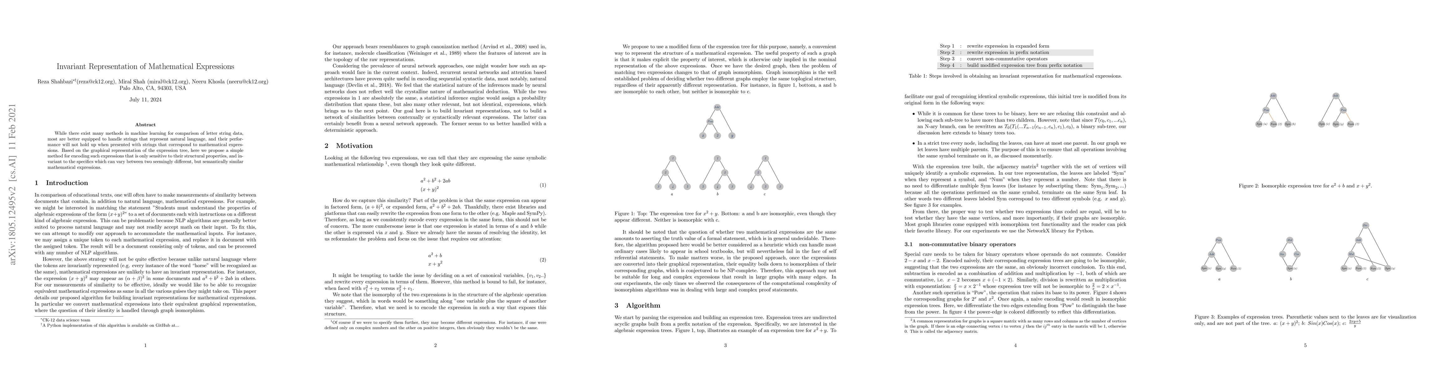 This paper proposes a method for encoding mathematical expressions based on their expression tree structure, ensuring invariance to variations in representation while maintaining sensitivity to structural properties, thus improving the comparison of semantically similar expressions.