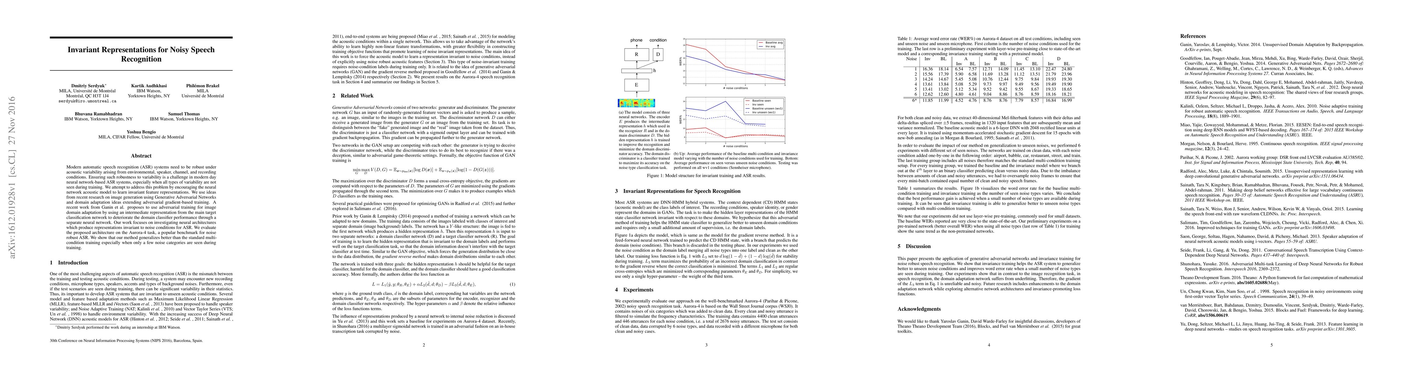 This paper investigates neural architectures for automatic speech recognition (ASR) that learn invariant feature representations to improve robustness against environmental noise. The proposed method employs adversarial training to generalize better, especially when only a few noise conditions are present during training, as demonstrated on the Aurora-4 benchmark.
