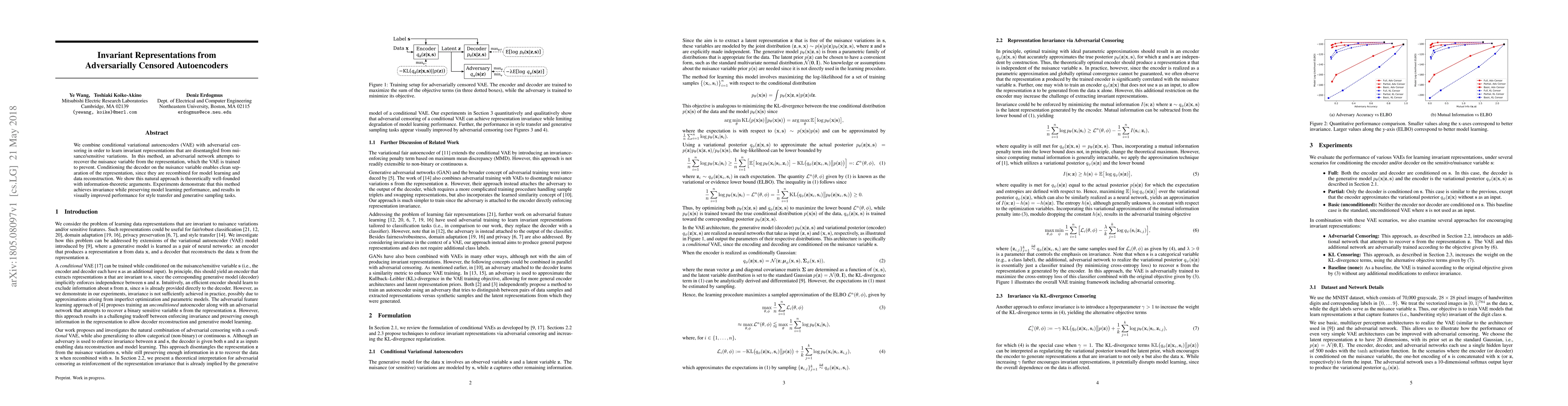 This paper combines conditional VAEs with adversarial censoring to learn invariant, disentangled representations. The adversarial network aims to recover nuisance variables, which the VAE is trained to ignore, leading to improved performance in style transfer and generative tasks.