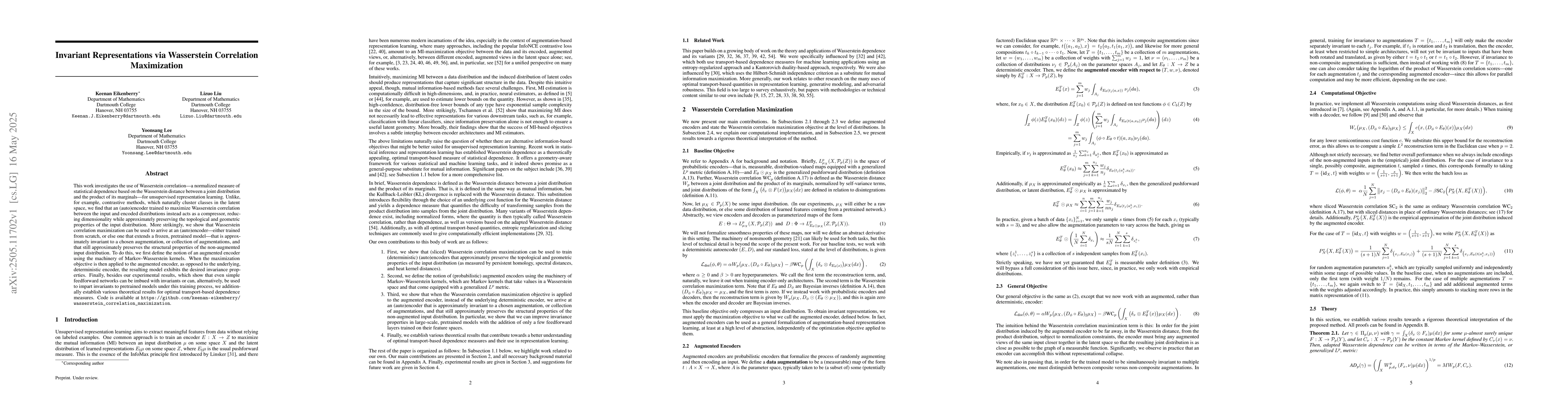 The research employs Wasserstein correlation maximization for unsupervised representation learning, using autoencoders to compress input data while preserving topological and geometric properties. It introduces an augmented encoder via Markov-Wasserstein kernels to achieve invariance to chosen augmentations.
