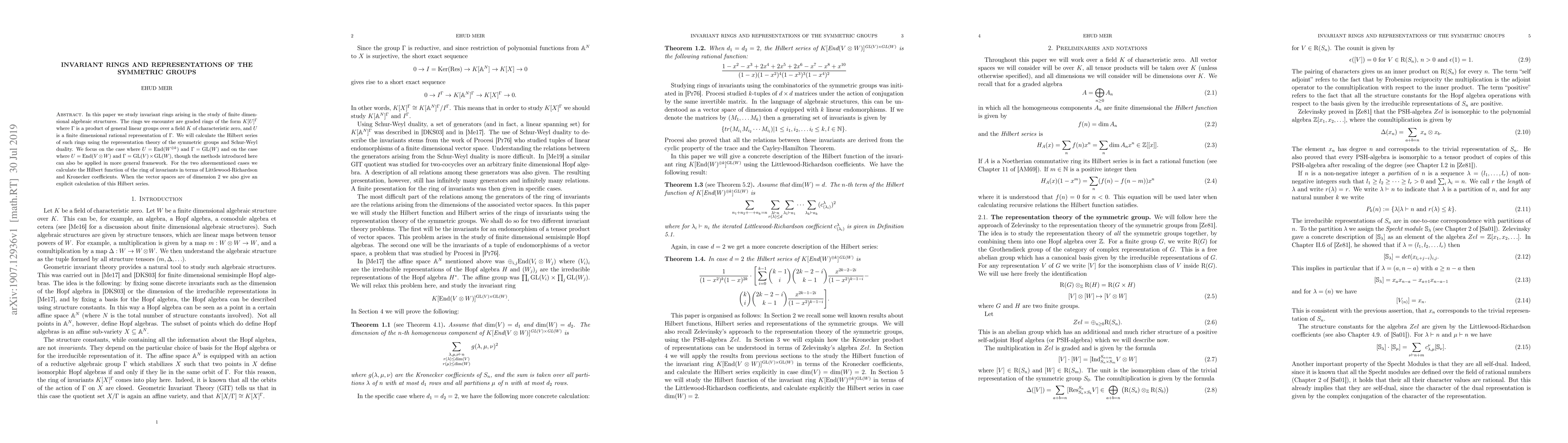 This paper explores invariant rings of finite dimensional algebraic structures using representation theory of symmetric groups and Schur-Weyl duality, focusing on specific cases to calculate Hilbert series and coefficients.