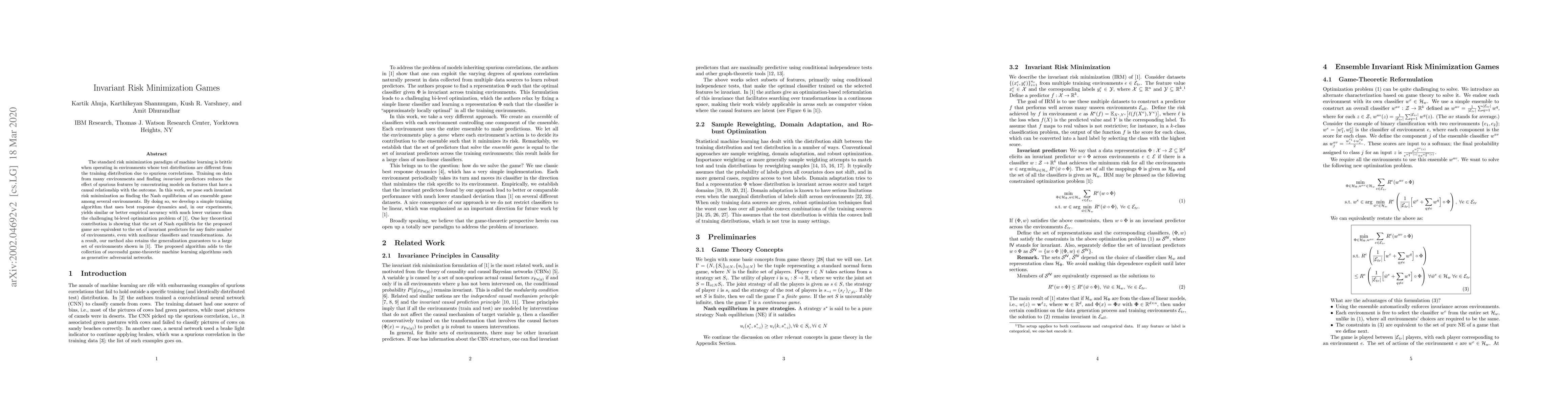 This paper proposes invariant risk minimization as a Nash equilibrium in a game among multiple environments to reduce the impact of spurious correlations in machine learning. The developed algorithm achieves similar or better empirical accuracy with lower variance compared to existing bi-level optimization methods, while maintaining generalization guarantees.