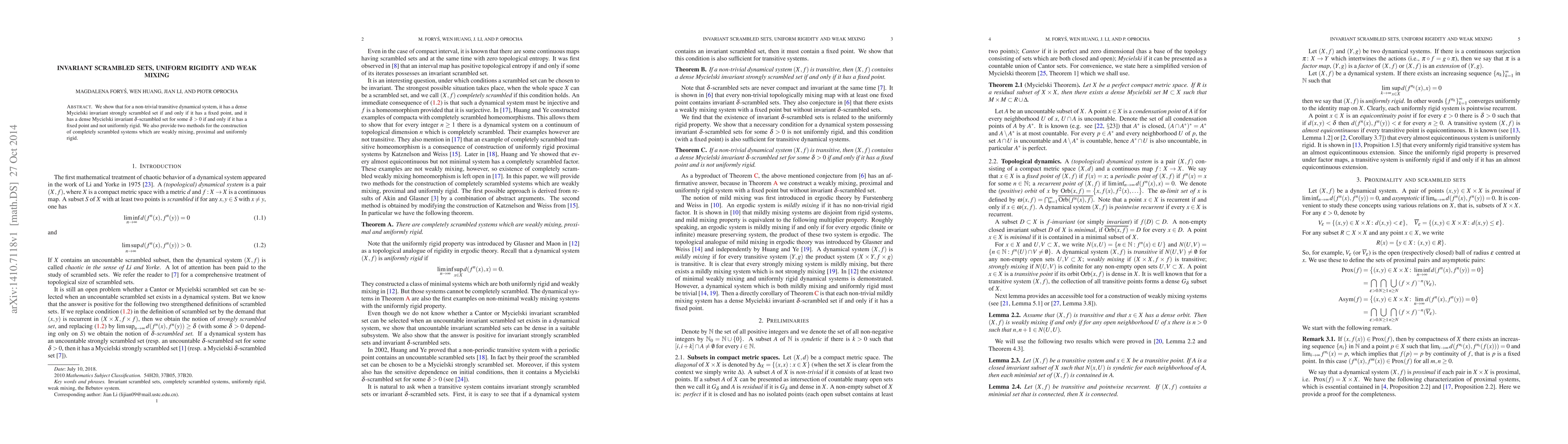 This paper demonstrates the equivalence between the existence of dense Mycielski invariant scrambled sets in a transitive dynamical system and the presence of fixed points, while also exploring the relationship with uniform rigidity and weak mixing properties. It introduces methods to construct completely scrambled systems that exhibit weak mixing, proximality, and uniform rigidity.