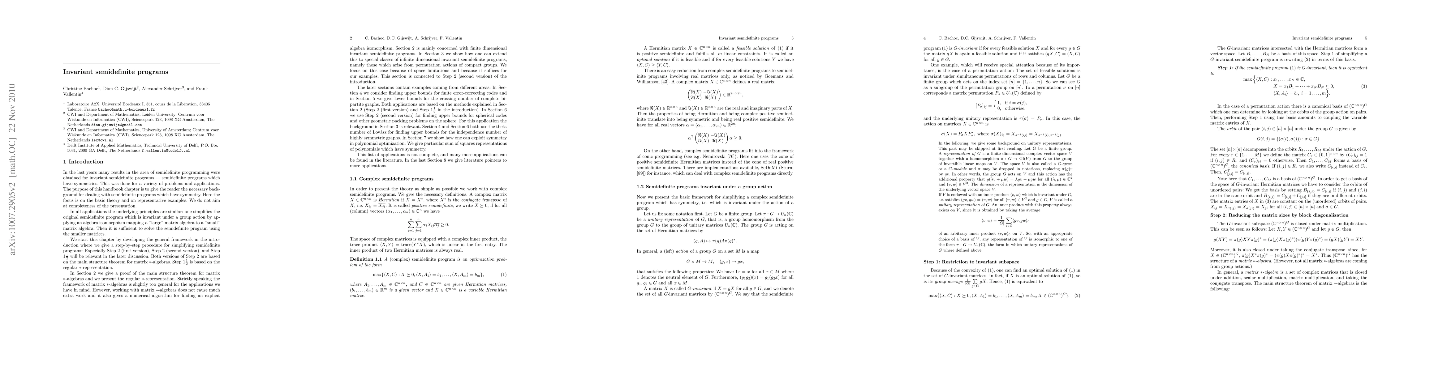 This handbook chapter provides an overview of the theory behind invariant semidefinite programs (SDPs) with symmetry, and illustrates its applications in coding theory, combinatorics, geometry, and polynomial optimization. It aims to equip readers with the necessary background to understand and tackle such symmetric SDPs.