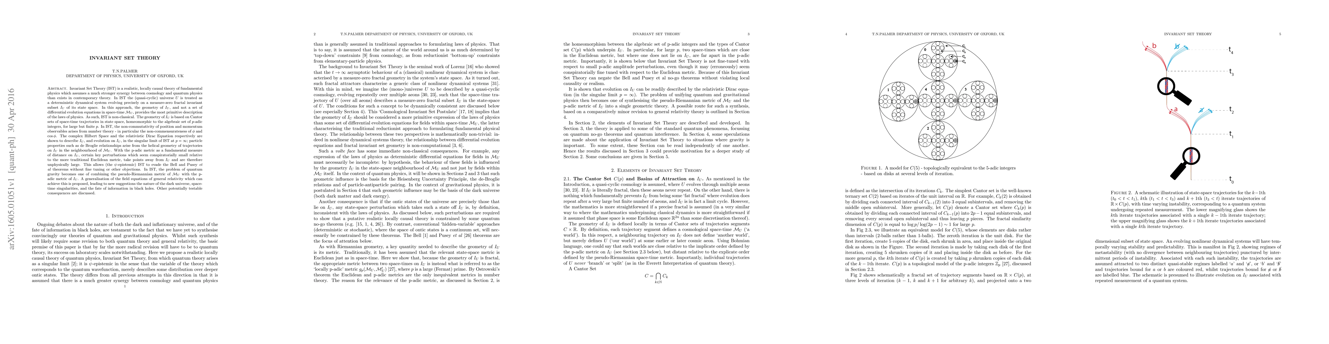 Invariant Set Theory (IST) is a realistic, locally causal theory of fundamental physics which assumes a much stronger synergy between cosmology and quantum physics than exists in contemporary theory. In IST the (quasi-cyclic) universe $U$ is treated as a deterministic dynamical system evolving precisely on a measure-zero fractal invariant subset $I_U$ of its state space. In this approach, the geometry of $I_U$, and not a set of differential evolution equations in space-time $\mathcal M_U$, provides the most primitive description of the laws of physics. As such, IST is non-classical. The geometry of $I_U$ is based on Cantor sets of space-time trajectories in state space, homeomorphic to the algebraic set of $p$-adic integers, for large but finite $p$. In IST, the non-commutativity of position and momentum observables arises from number theory - in particular the non-commensurateness of $\phi$ and $\cos \phi$. The complex Hilbert Space and the relativistic Dirac Equation respectively are shown to describe $I_U$, and evolution on $I_U$, in the singular limit of IST at $p=\infty$; particle properties such as de Broglie relationships arise from the helical geometry of trajectories on $I_U$ in the neighbourhood of $\mathcal M_U$. With the p-adic metric as a fundamental measure of distance on $I_U$, certain key perturbations which seem conspiratorially small relative to the more traditional Euclidean metric, take points away from $I_U$ and are therefore unphysically large. This allows (the $\psi$-epistemic) IST to evade the Bell and Pusey et al theorems without fine tuning or other objections. In IST, the problem of quantum gravity becomes one of combining the pseudo-Riemannian metric of $\mathcal M_U$ with the p-adic metric of $I_U$. A generalisation of the field equations of general relativity which can achieve this is proposed.