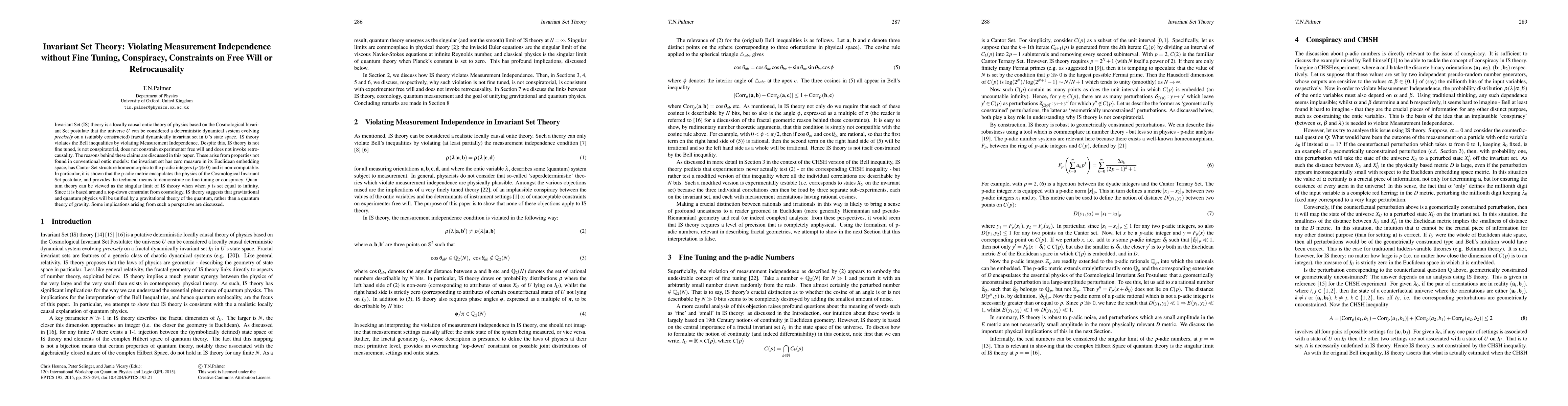Invariant Set (IS) theory is a locally causal ontic theory of physics based on the Cosmological Invariant Set postulate that the universe $U$ can be considered a deterministic dynamical system evolving precisely on a (suitably constructed) fractal dynamically invariant set in $U$'s state space. IS theory violates the Bell inequalities by violating Measurement Independence. Despite this, IS theory is not fine tuned, is not conspiratorial, does not constrain experimenter free will and does not invoke retrocausality. The reasons behind these claims are discussed in this paper. These arise from properties not found in conventional ontic models: the invariant set has zero measure in its Euclidean embedding space, has Cantor Set structure homeomorphic to the p-adic integers ($p \ggg 0$) and is non-computable. In particular, it is shown that the p-adic metric encapulates the physics of the Cosmological Invariant Set postulate, and provides the technical means to demonstrate no fine tuning or conspiracy. Quantum theory can be viewed as the singular limit of IS theory when when $p$ is set equal to infinity. Since it is based around a top-down constraint from cosmology, IS theory suggests that gravitational and quantum physics will be unified by a gravitational theory of the quantum, rather than a quantum theory of gravity. Some implications arising from such a perspective are discussed.
