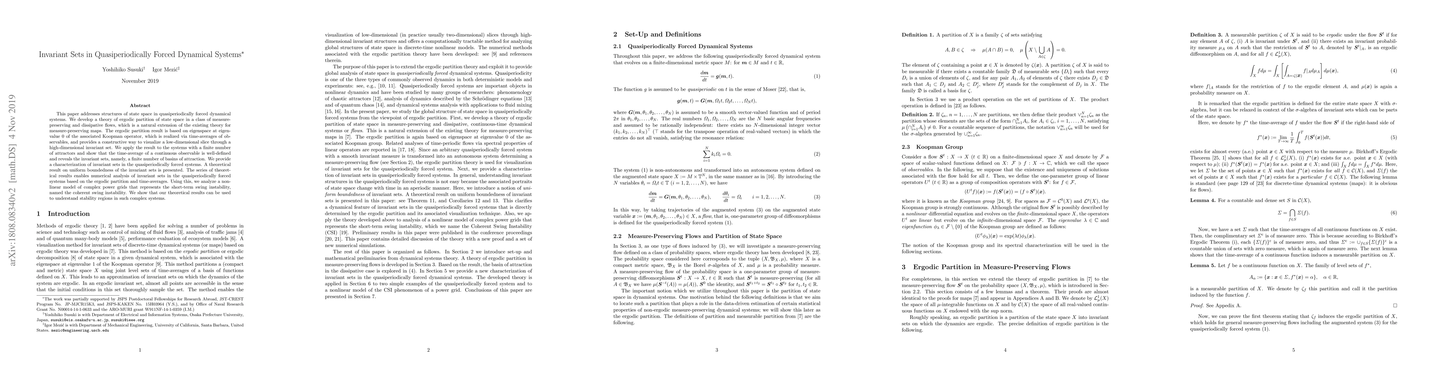 This paper addresses structures of state space in quasiperiodically forced dynamical systems. We develop a theory of ergodic partition of state space in a class of measure-preserving and dissipative flows, which is a natural extension of the existing theory for measure-preserving maps. The ergodic partition result is based on eigenspace at eigenvalue 0 of the associated Koopman operator, which is realized via time-averages of observables, and provides a constructive way to visualize a low-dimensional slice through a high-dimensional invariant set. We apply the result to the systems with a finite number of attractors and show that the time-average of a continuous observable is well-defined and reveals the invariant sets, namely, a finite number of basins of attraction. We provide a characterization of invariant sets in the quasiperiodically forced systems. A theoretical result on uniform boundedness of the invariant sets is presented. The series of theoretical results enables numerical analysis of invariant sets in the quasiperiodically forced systems based on the ergodic partition and time-averages. Using this, we analyze a nonlinear model of complex power grids that represents the short-term swing instability, named the coherent swing instability. We show that our theoretical results can be used to understand stability regions in such complex systems.
