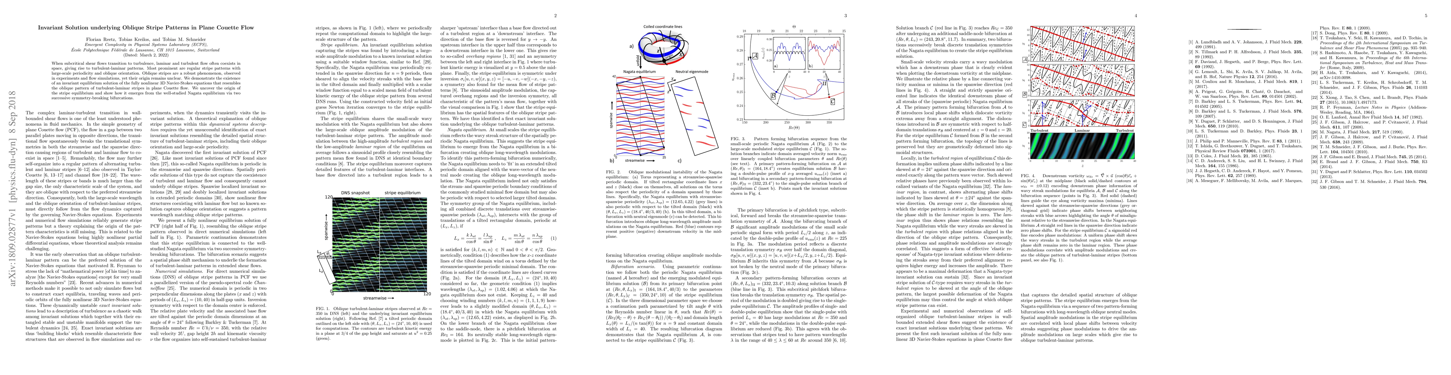 When subcritical shear flows transition to turbulence, laminar and turbulent flow often coexists in space, giving rise to turbulent-laminar patterns. Most prominent are regular stripe patterns with large-scale periodicity and oblique orientation. Oblique stripes are a robust phenomenon, observed in experiments and flow simulations, yet their origin remains unclear. We demonstrate the existence of an invariant equilibrium solution of the fully nonlinear 3D Navier-Stokes equations that resembles the oblique pattern of turbulent-laminar stripes in plane Couette flow. We uncover the origin of the stripe equilibrium and show how it emerges from the well-studied Nagata equilibrium via two successive symmetry-breaking bifurcations.