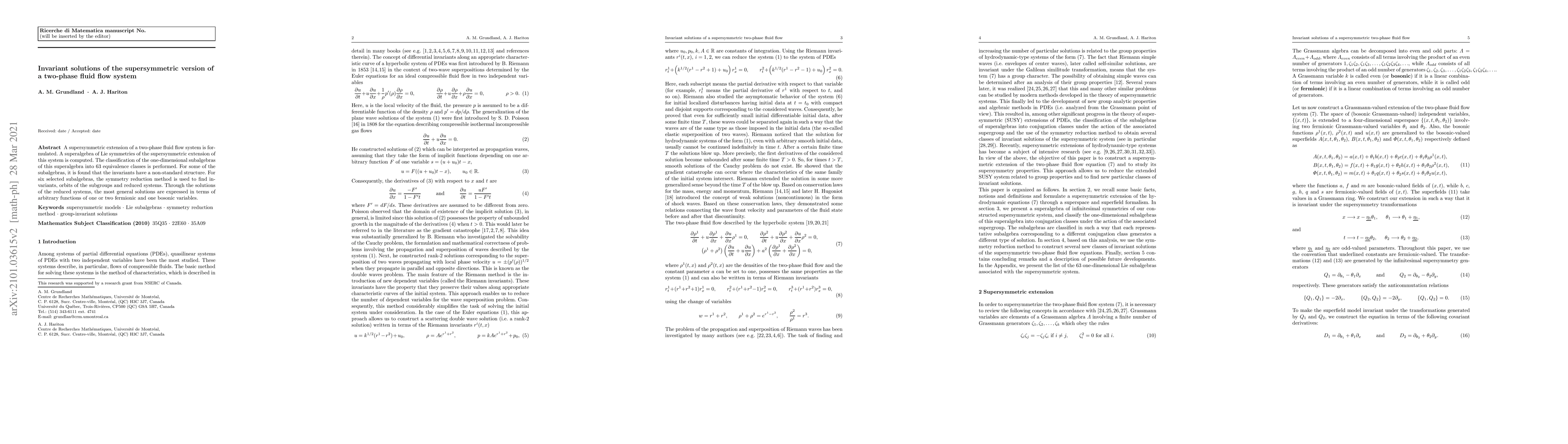 A supersymmetric extension of the two-phase fluid flow system is formulated. A superalgebra of Lie symmetries of the supersymmetric extension of this system is computed. The classification of the one-dimensional subalgebras of this superalgebra into 63 equivalence conjugation classes is performed. For some of the subalgebras, it is found that the invariants have a non-standard structure. For six selected subalgebras, the symmetry reduction method is used to find invariants, orbits of the subgroups and reduced systems. Through the solutions of the reduced systems, the most general solutions are expressed in terms of arbitrary functions of one or two fermionic and one bosonic variables.