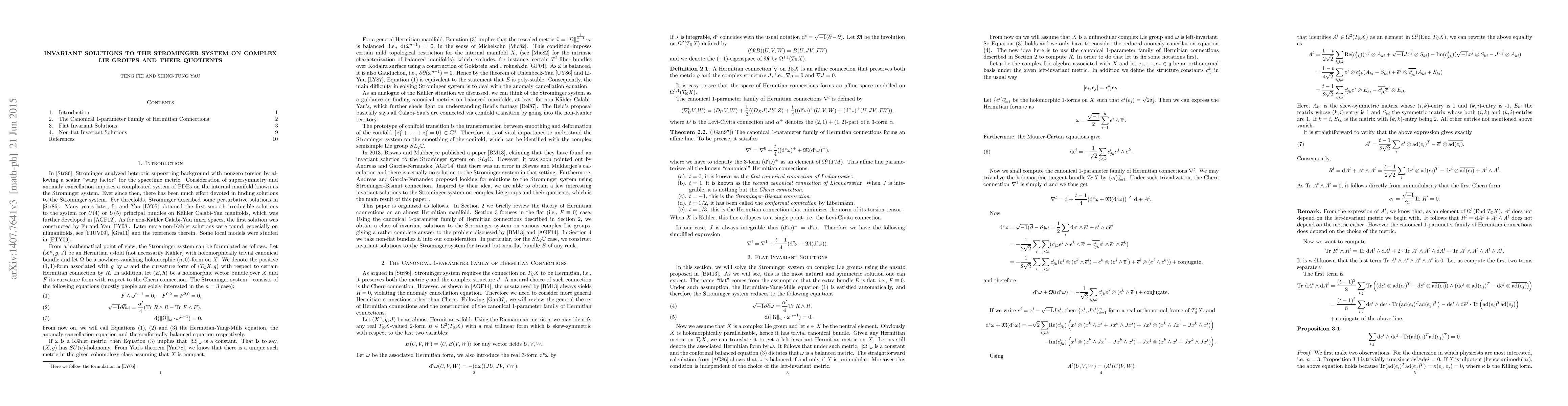 Using canonical 1-parameter family of Hermitian connections on the tangent bundle, we provide invariant solutions to the Strominger system on complex Lie groups. Both flat and non-flat cases are discussed in detail.