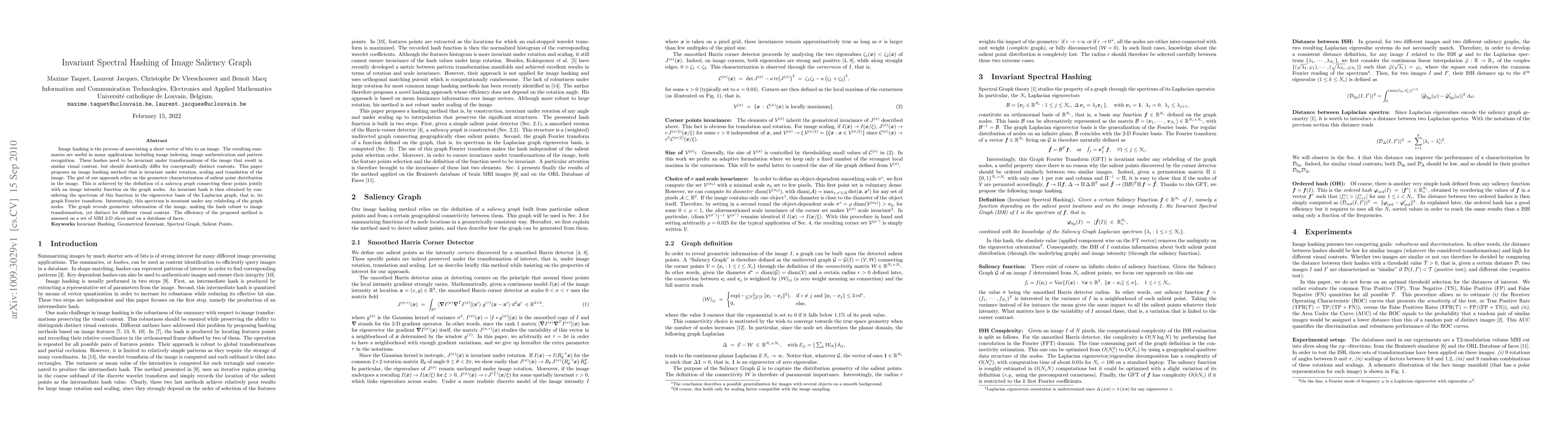 This paper introduces an invariant image hashing method based on a saliency graph that captures salient points and their distribution, using the graph's Laplacian spectrum for robust hashing against image transformations like rotation, scaling, and translation. The method is evaluated on MRI slices and face images.