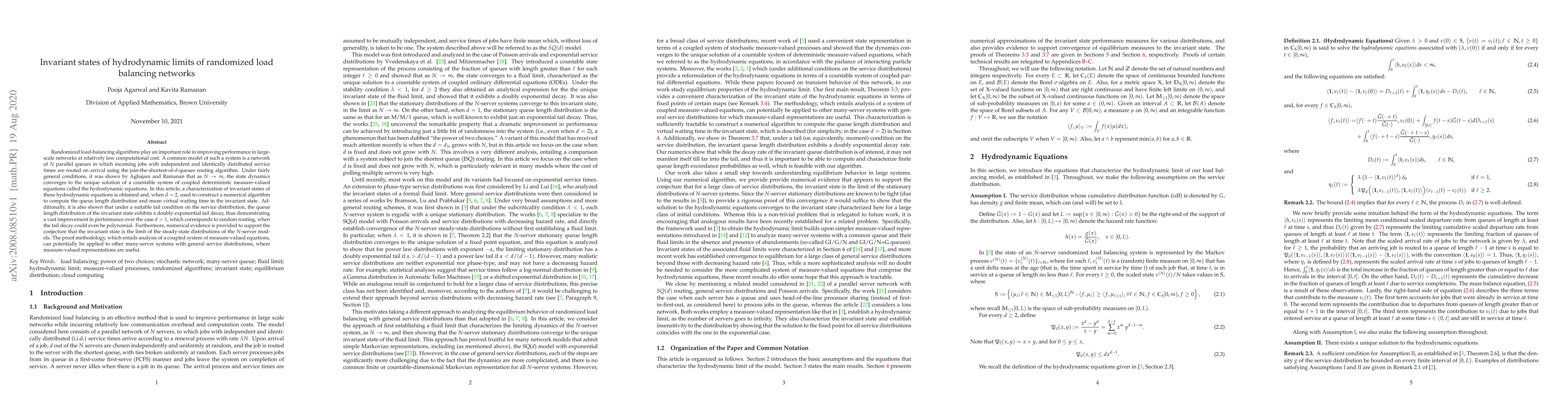 Researchers develop a characterization of invariant states in hydrodynamic equations for randomized load-balancing networks, showing improved performance with doubly exponential tail decay, and demonstrate the limit of steady-state distributions for N-server models.