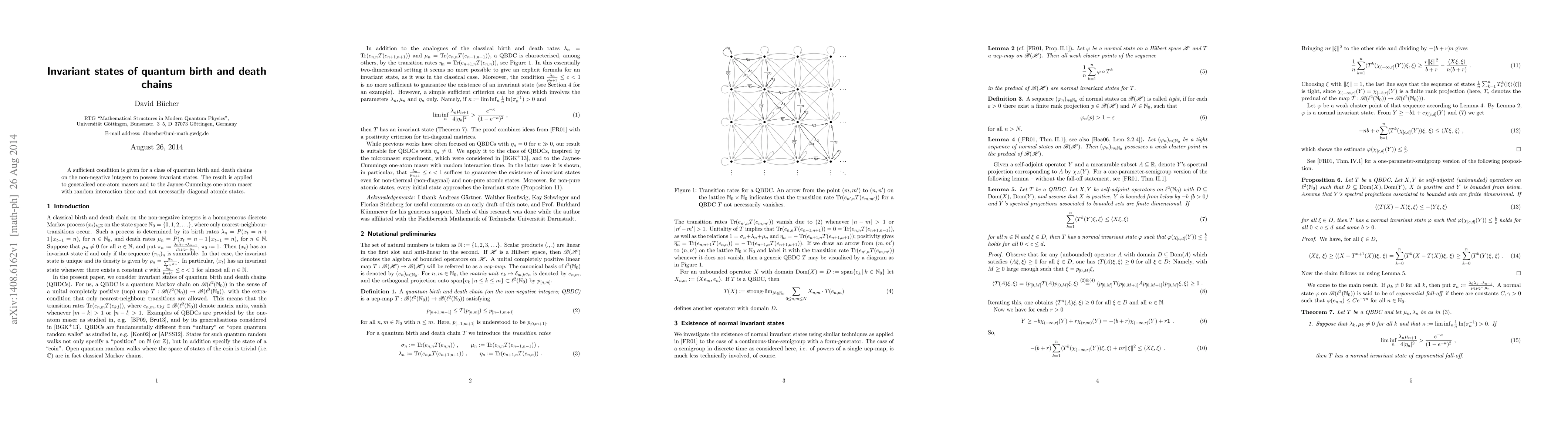 A sufficient condition is given for a class of quantum birth and death chains on the non-negative integers to possess invariant states. The result is applied to generalised one-atom masers and to the Jaynes-Cummings one-atom maser with random interaction time and not necessarily diagonal atomic states.