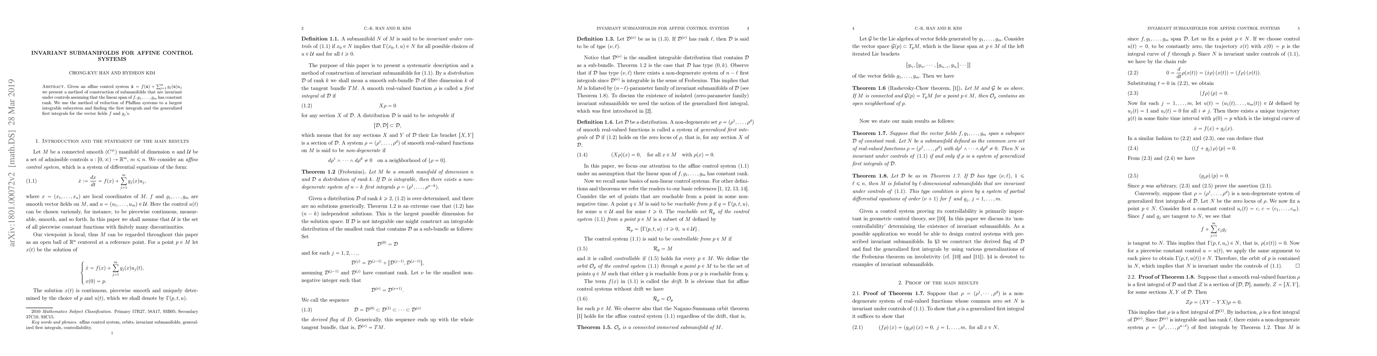 Given an affine control system $\dot{\mathbf x} = f({\mathbf x}) + \sum_{j=1}^m g_j({\mathbf x}) u_j$ we present an algorithmic process of construction of submanifolds that are invariant under controls assuming that the linear span of $f, g_1, \ldots, g_m$ has constant rank. We use the method of reduction of Pfaffian systems to a largest integrable subsystem and finding the first integrals and the generalized first integrals for the vector fields.