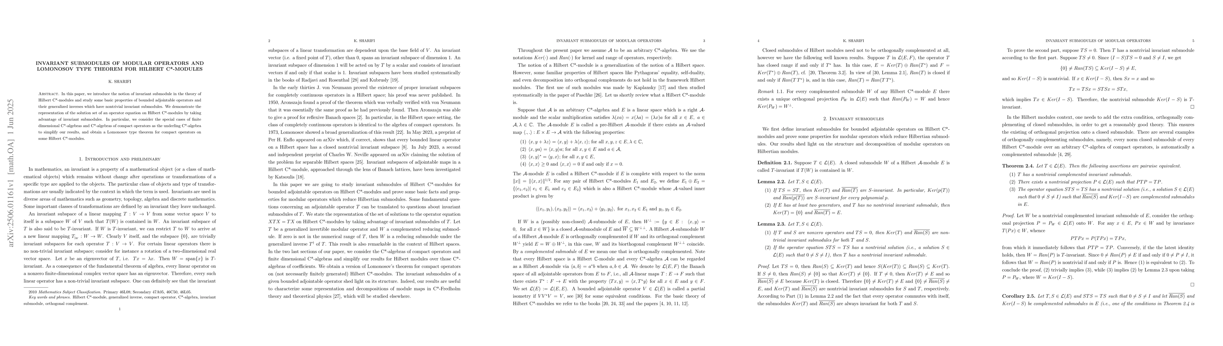 The development of invariant submodule theory within Hilbert C*-modules and its application to operator equations, leading to a Lomonosov-type theorem for compact operators.
