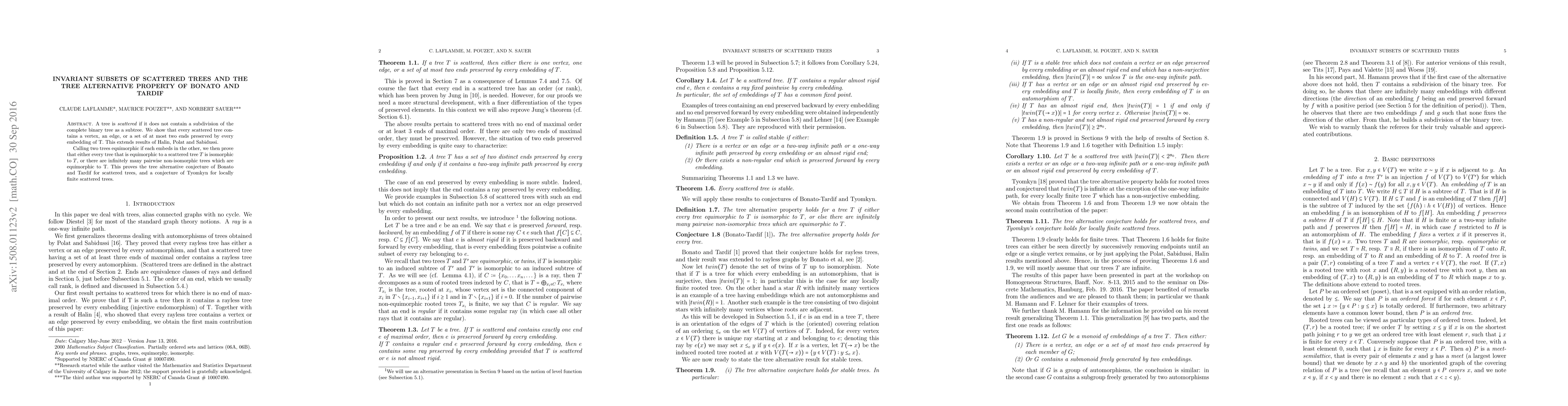 A tree is scattered if no subdivision of the complete binary tree is a subtree. Building on results of Halin, Polat and Sabidussi, we identify four types of subtrees of a scattered tree and a function of the tree into the integers at least one of which is preserved by every embedding. With this result and a result of Tyomkyn, we prove that the tree alternative property conjecture of Bonato and Tardif holds for scattered trees and a conjecture of Tyomkin holds for locally finite scattered trees.
