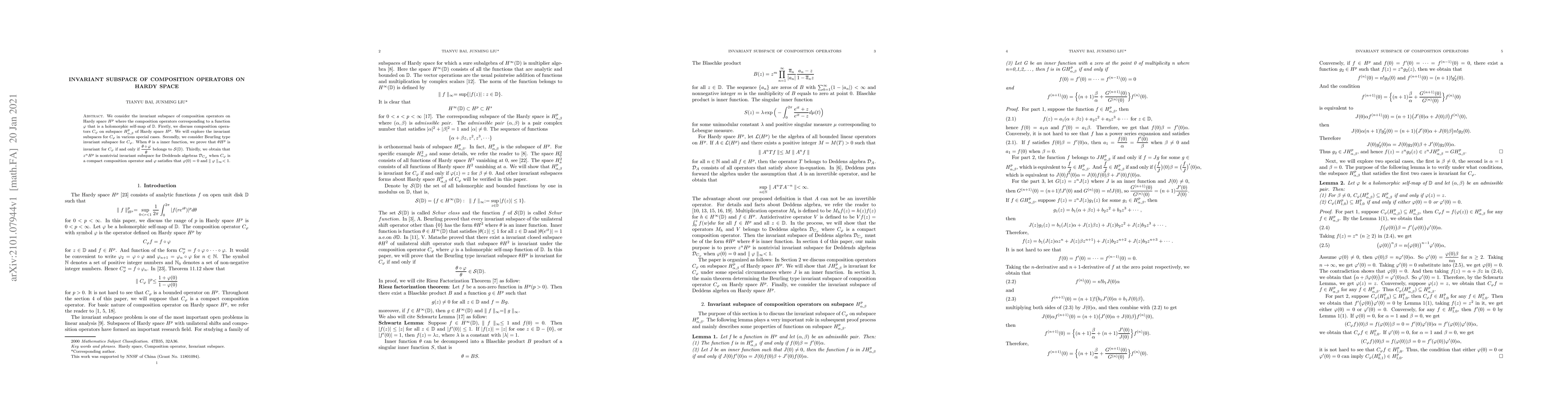 We consider the invariant subspace of composition operators on Hardy space $H^p$ where the composition operators corresponding to a function $\varphi$ that is a holomorphic self-map of $\mathbb D$. Firstly, we discuss composition operators $C_\varphi$ on subspace $H_{\alpha,\beta}^p$ of Hardy space $H^p$. We will explore the invariant subspaces for $C_\varphi$ in various special cases. Secondly, we consider Beurling type invariant subspace for $C_\varphi$. When $\theta$ is a inner function, we prove that $\theta H^p$ is invariant for $C_\varphi$ if and only if $\displaystyle{\frac{\theta\circ\varphi}{\theta}}$ belongs to $\mathcal S(\mathbb D)$. Thirdly, we obtain that $z^nH^p$ is nontrivial invariant subspace for Deddends algebras $\mathcal D_{C_\varphi}$ when $C_\varphi$ is a compact composition operator and $\varphi$ satisfies that $\varphi(0)=0$ and $\parallel\varphi\parallel_\infty<1$.