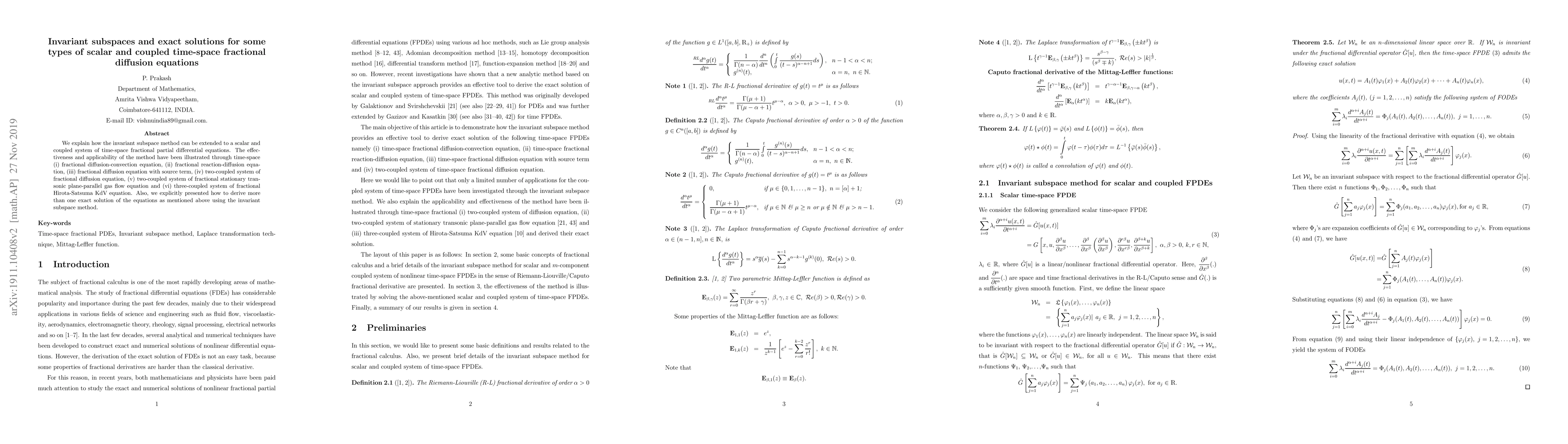 This paper extends the invariant subspace method to solve various scalar and coupled time-space fractional diffusion equations, demonstrating its effectiveness through several specific examples including fractional diffusion-convection, reaction-diffusion, and coupled systems, and presenting multiple exact solutions.