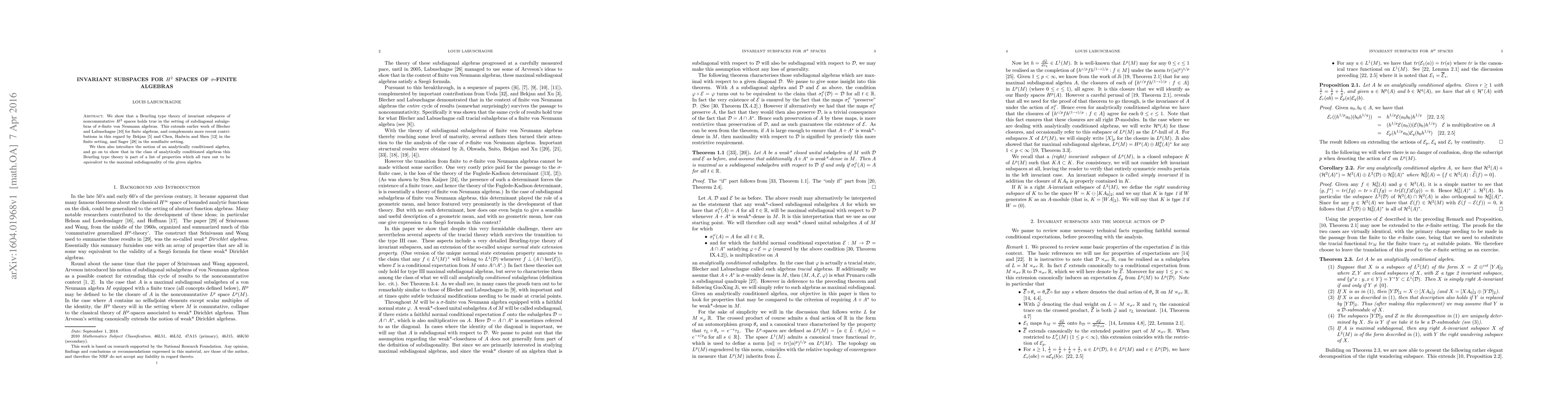 This paper extends Beurling's invariant subspace theory to noncommutative $H^2$ spaces within subdiagonal subalgebras of $\sigma$-finite von Neumann algebras, generalizing previous results for finite algebras. It also introduces analytically conditioned algebras, proving that Beurling's theory is part of a set of properties equivalent to maximal subdiagonality in this class.