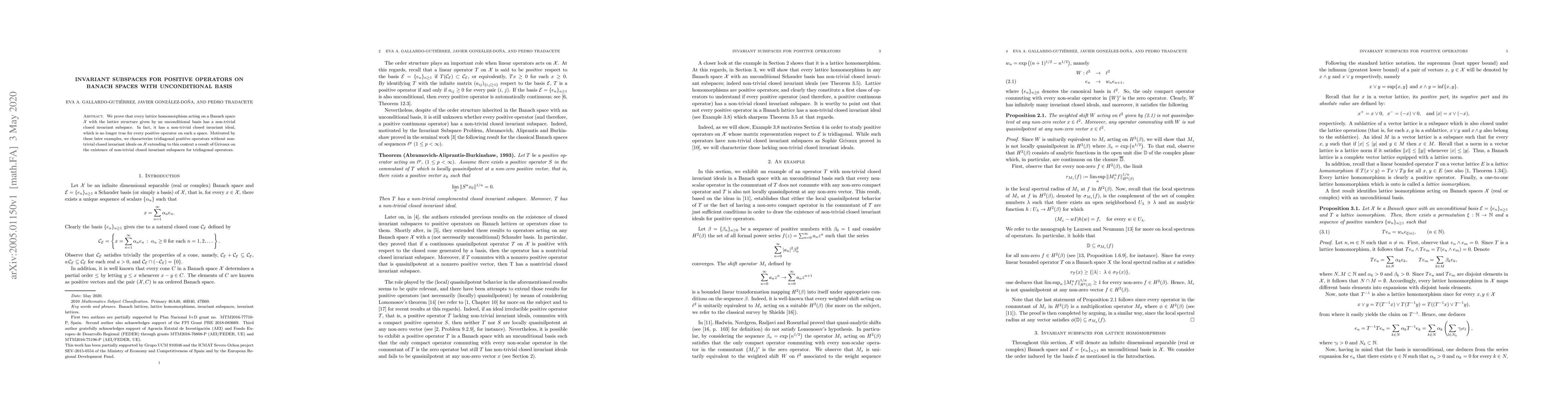 We prove that every lattice homomorphism acting on a Banach space $\mathcal{X}$ with the lattice structure given by an unconditional basis has a non-trivial closed invariant subspace. In fact, it has a non-trivial closed invariant ideal, which is no longer true for every positive operator on such a space. Motivated by these later examples, we characterize tridiagonal positive operators without non-trivial closed invariant ideals on $\mathcal{X}$ extending to this context a result of Grivaux on the existence of non-trivial closed invariant subspaces for tridiagonal operators.