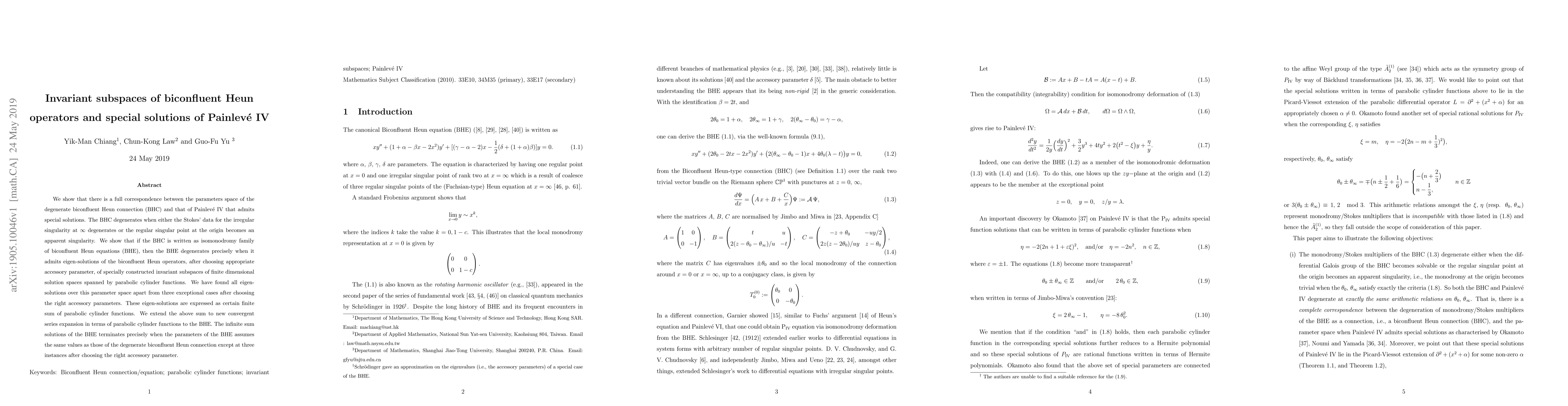 This paper establishes a correspondence between the parameter spaces of degenerate biconfluent Heun connections and Painlevé IV equations, revealing that the biconfluent Heun equations' degeneration occurs when they admit eigen-solutions in specially constructed invariant subspaces. These eigen-solutions are expressed as finite sums of parabolic cylinder functions, with an extension to convergent series expansions.