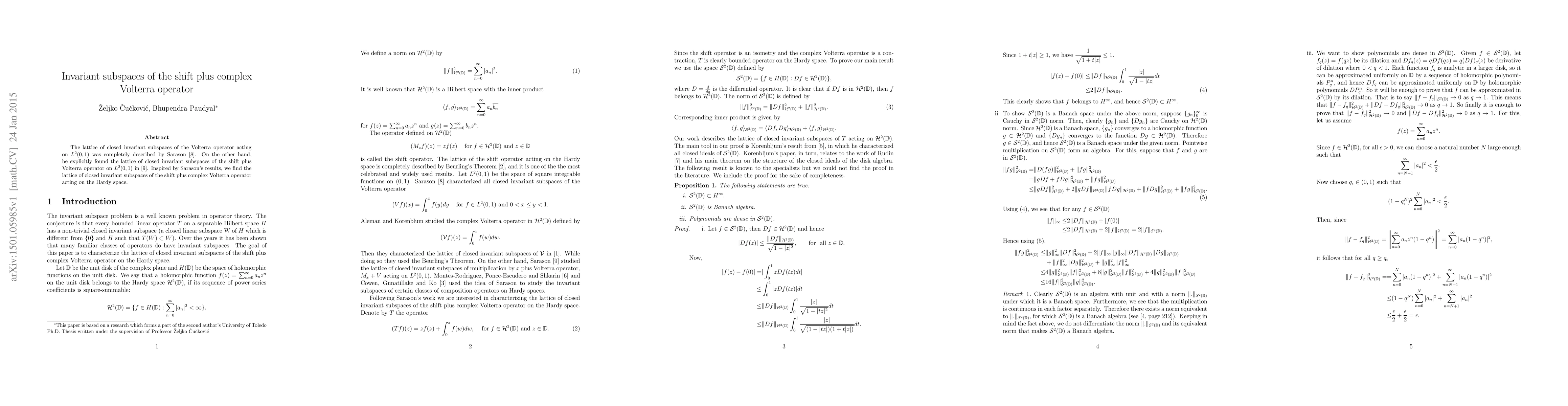 The paper provides a complete characterization of closed invariant subspaces for the shift plus complex Volterra operator on the Hardy space, building upon Sarason's work on the shift plus Volterra operator.