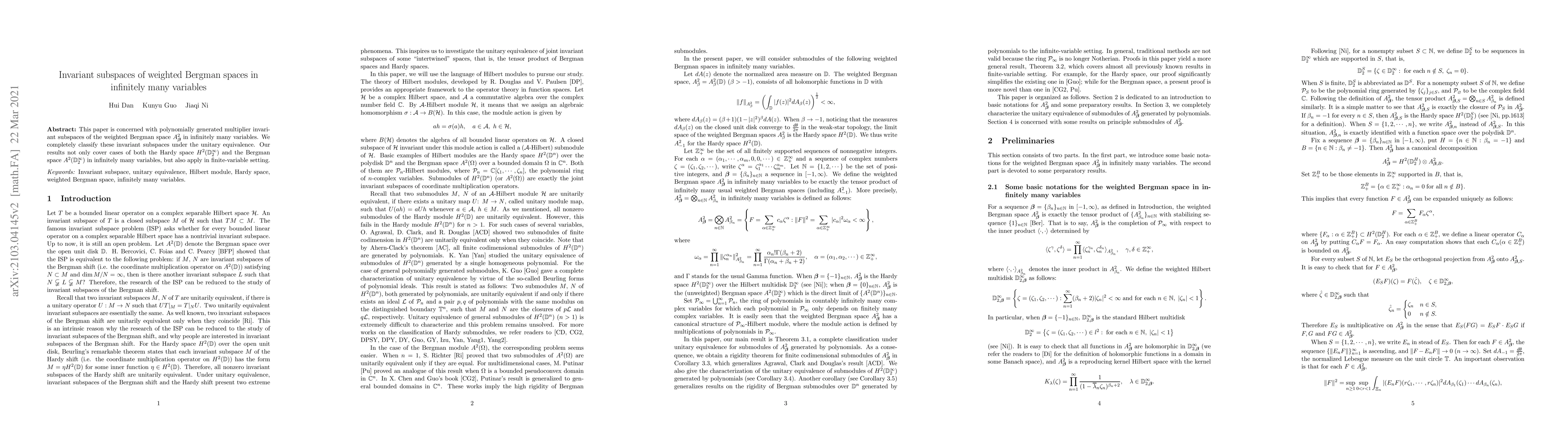 This paper classifies polynomially generated multiplier invariant subspaces of the weighted Bergman space $A_{\boldsymbol{\beta}}^2$ in infinitely many variables under unitary equivalence. The results extend to both Hardy and Bergman spaces in infinite and finite dimensions.