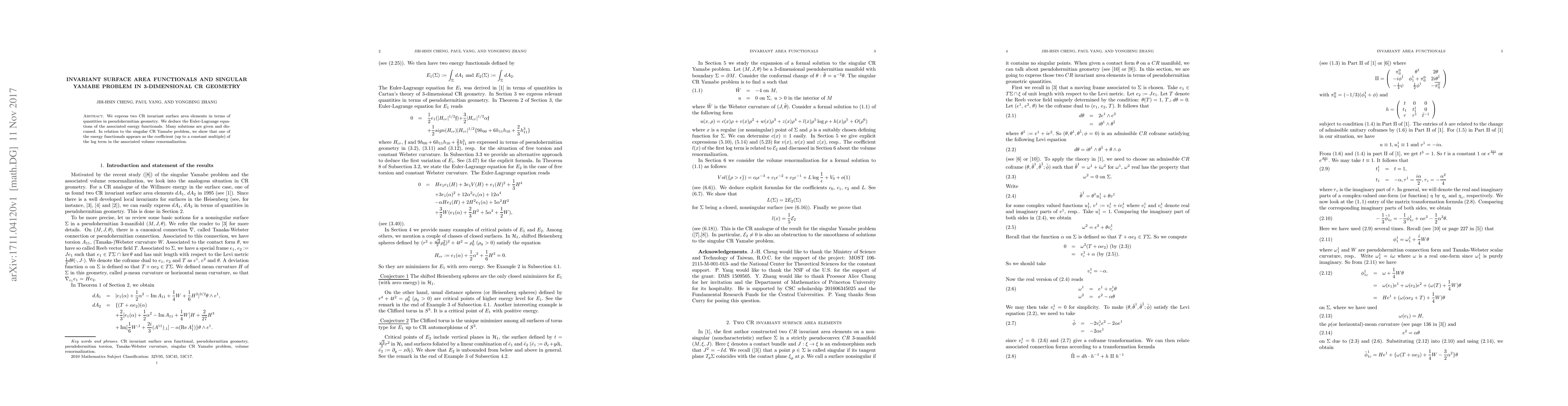 We express two CR invariant surface area elements in terms of quantities in pseudohermitian geometry. We deduce the Euler-Lagrange equations of the associated energy functionals. Many solutions are given and discussed. In relation to the singular CR Yamabe problem, we show that one of the energy functionals appears as the coefficient (up to a constant multiple) of the log term in the associated volume renormalization.