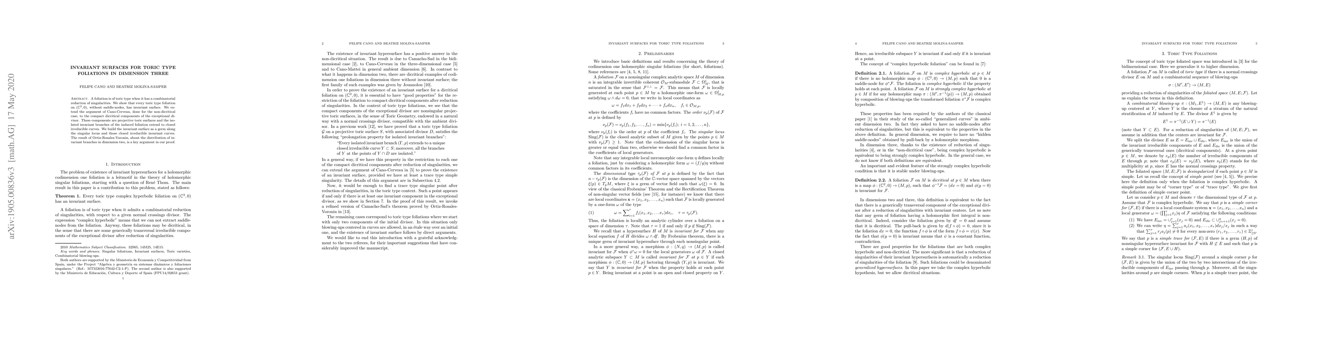 This paper demonstrates that every toric type foliation on (C³, 0) without saddle-nodes possesses an invariant surface. The authors extend previous arguments to include compact dicritical components, constructing the invariant surface using global curves and leveraging results on the distribution of invariant curves in lower dimensions.