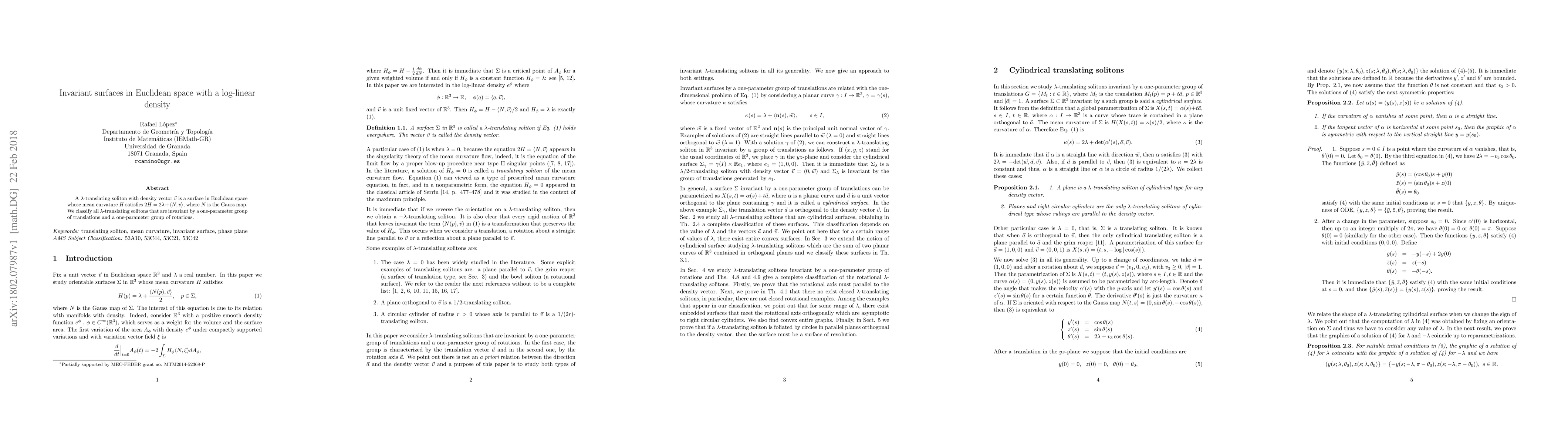 This paper classifies $\lambda$-translating solitons in Euclidean space that are invariant under both translations and rotations, characterized by a log-linear density vector $\vec{v}$ and mean curvature relation $2H=2\lambda+\langle N,\vec{v}\rangle$. The study reveals the geometric properties of these invariant surfaces.