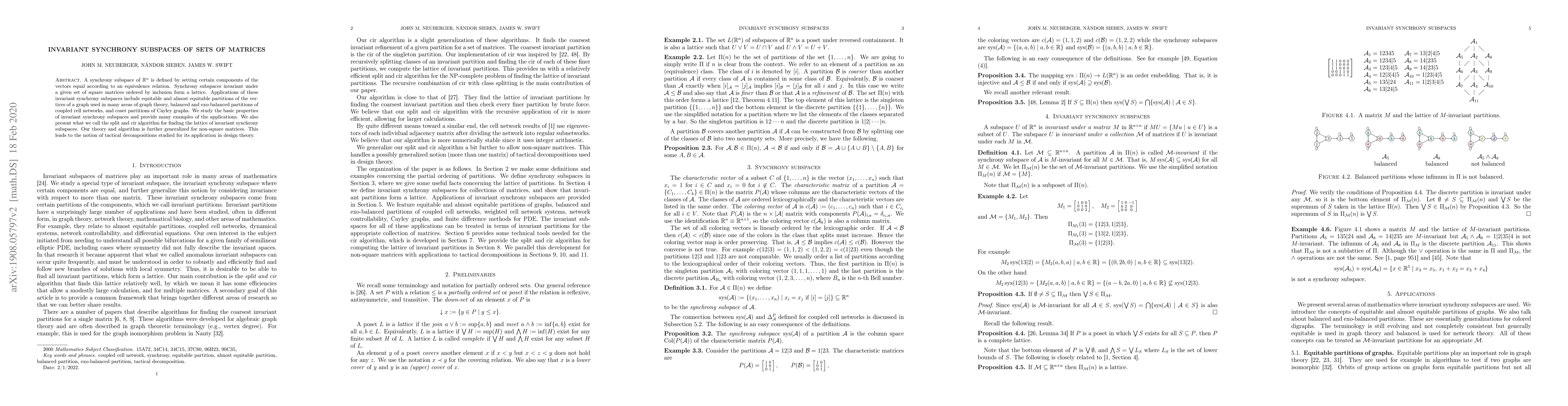This paper explores invariant synchrony subspaces formed by matrices, which are subspaces where certain vector components are equated, and studies their lattice structure. It applies the concept to graph theory, coupled cell networks, and design theory, presenting a novel split and cir algorithm for identifying these subspaces, extending the theory to non-square matrices.