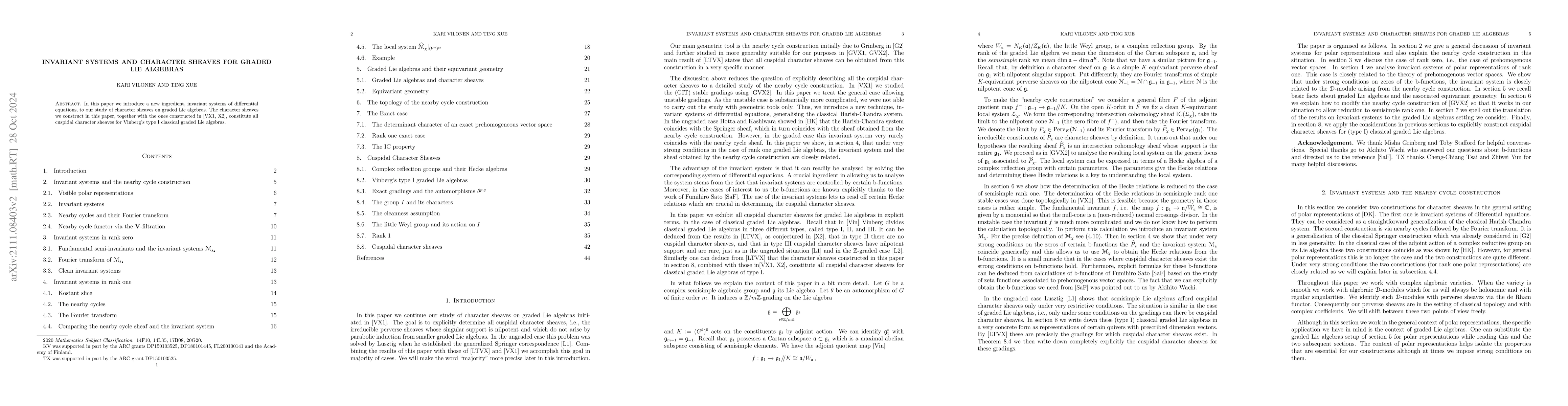 This paper constructs character sheaves for type I graded classical Lie algebras, utilizing invariant systems of differential equations to achieve cuspidal properties. The method provides a novel approach to understanding the structure of these sheaves.