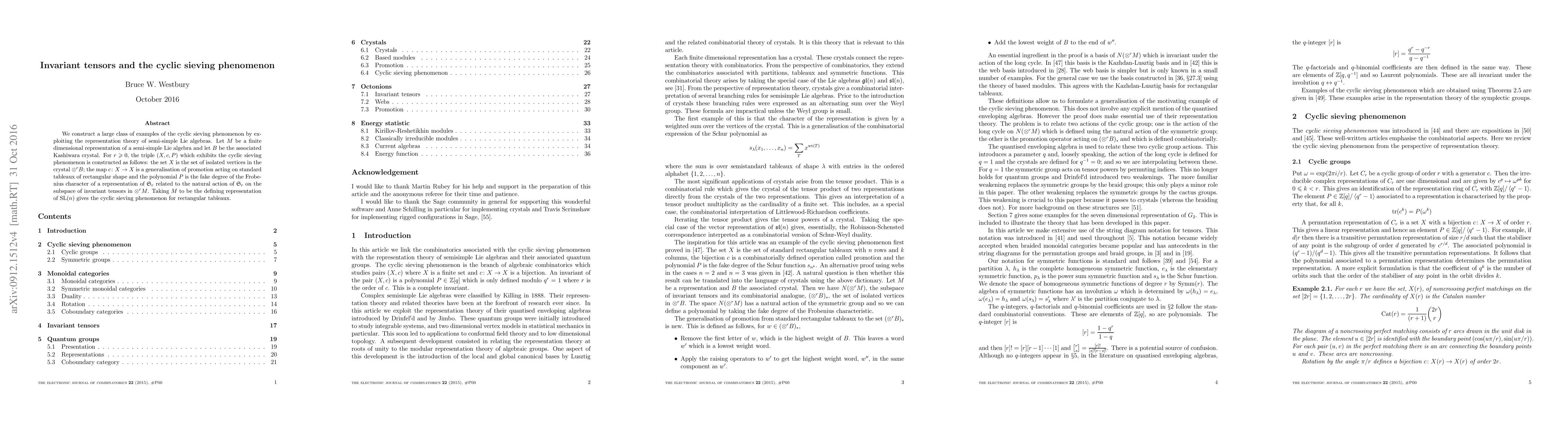 We construct a large class of examples of the cyclic sieving phenomenon by expoiting the representation theory of semi-simple Lie algebras. Let $M$ be a finite dimensional representation of a semi-simple Lie algebra and let $B$ be the associated Kashiwara crystal. For $r\ge 0$, the triple $(X,c,P)$ which exhibits the cyclic sieving phenomenon is constructed as follows: the set $X$ is the set of isolated vertices in the crystal $\otimes^rB$; the map $c\colon X\rightarrow X$ is a generalisation of promotion acting on standard tableaux of rectangular shape and the polynomial $P$ is the fake degree of the Frobenius character of a representation of $\mathfrak{S}_r$ related to the natural action of $\mathfrak{S}_r$ on the subspace of invariant tensors in $\otimes^rM$. Taking $M$ to be the defining representation of $\mathrm{SL}(n)$ gives the cyclic sieving phenomenon for rectangular tableaux.