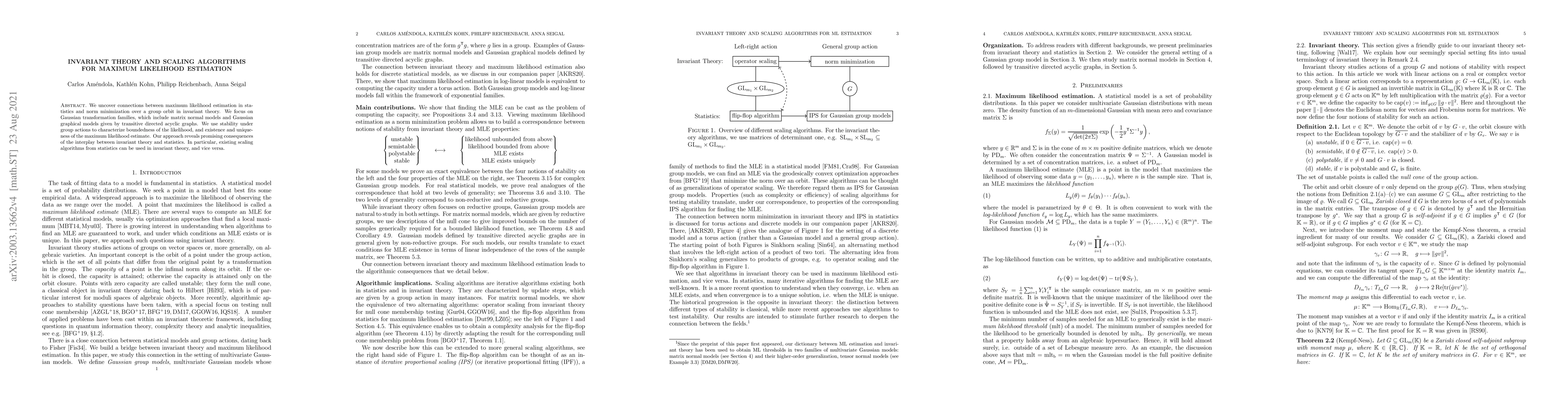This paper explores the relationship between maximum likelihood estimation in statistics and invariant theory, specifically focusing on Gaussian transformation families. It demonstrates how stability under group actions can characterize the boundedness and uniqueness of maximum likelihood estimates, revealing potential mutual benefits between scaling algorithms in statistics and invariant theory.