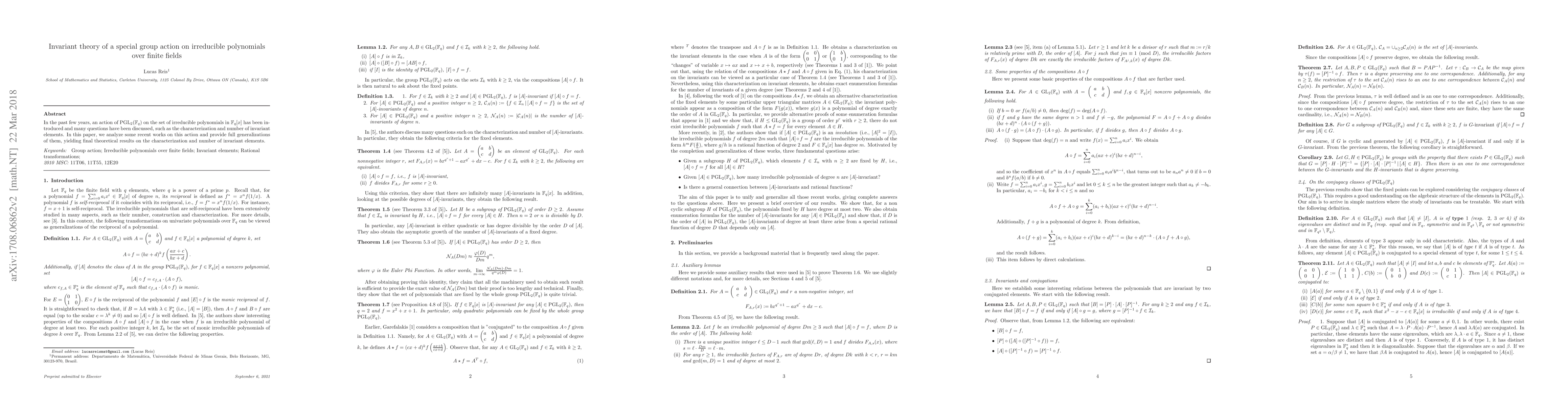In the past few years, an action of $\mathrm{PGL}_2(\mathbb F_q)$ on the set of irreducible polynomials in $\mathbb F_q[x]$ has been introduced and many questions have been discussed, such as the characterization and number of invariant elements. In this paper, we analyze some recent works on this action and provide full generalizations of them, yielding final theoretical results on the characterization and number of invariant elements.