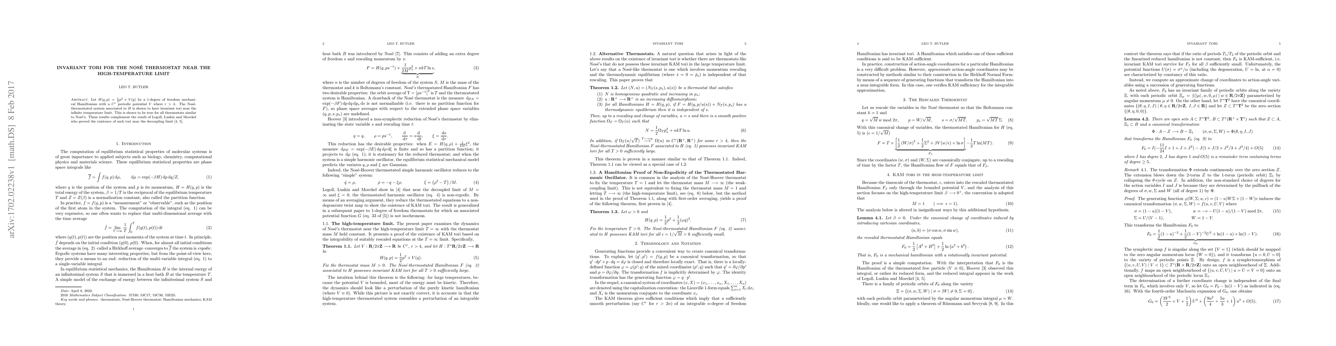 Let H(q,p) = p^2/2 + V(q) be a 1-degree of freedom mechanical Hamiltonian with a C^n periodic potential V where n>4. The Nos\'e-thermostated system associated to H is shown to have invariant tori near the infinite temperature limit. This is shown to be true for all thermostats similar to Nos\'e's. These results complement the result of Legoll, Luskin and Moeckel who proved the existence of such tori near the decoupling limit.