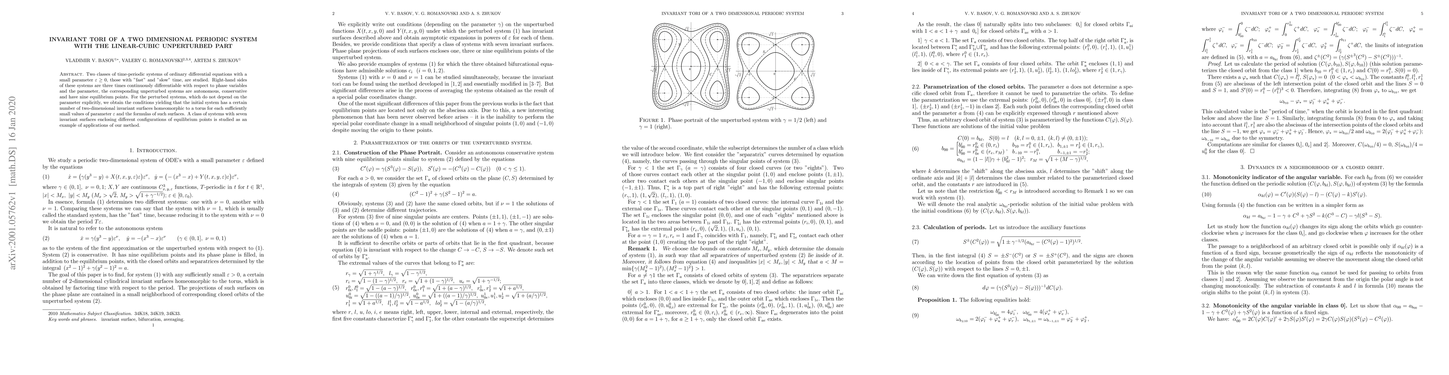 Two classes of time-periodic systems of ordinary differential equations with a small nonnegative parameter, those with fast and slow time, are studied. Right-hand sides of these systems are three times continuously differentiable with respect to phase variables and the parameter, the corresponding unperturbed systems are autonomous, conservative and have nine equilibrium points. For the perturbed systems, which do not depend on the parameter explicitly, we obtain the conditions yielding that the initial system has a certain number of two-dimensional invariant surfaces homeomorphic to a torus for each sufficiently small values of parameter and the formulas of such surfaces. A class of systems with seven invariant surfaces enclosing different configurations of equilibrium points is studied as an example of applications of our method.