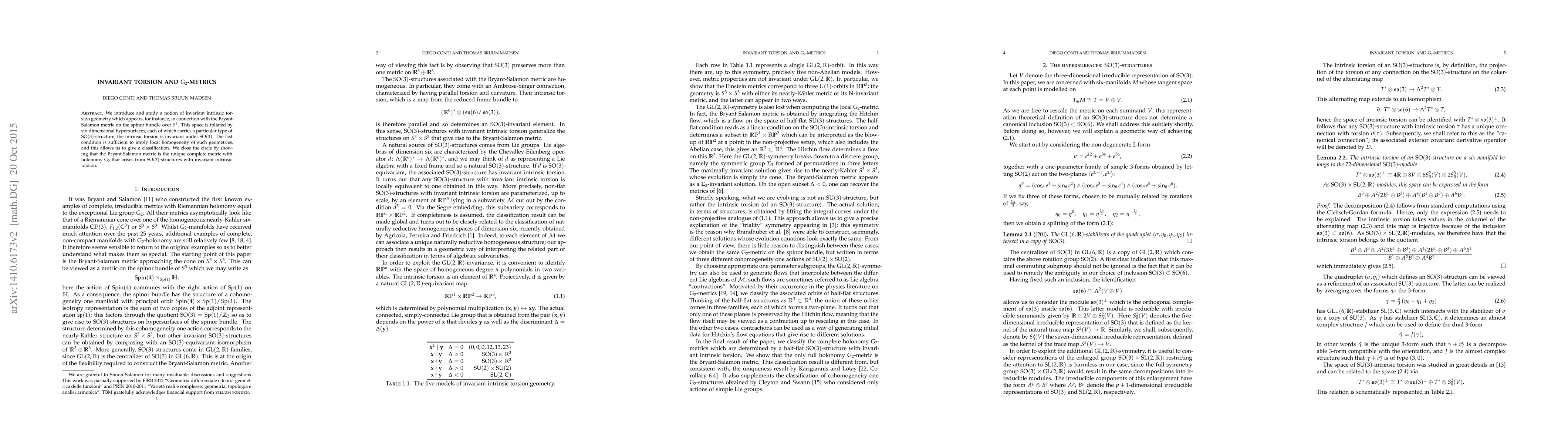 We introduce and study a notion of invariant intrinsic torsion geometry which appears, for instance, in connection with the Bryant-Salamon metric on the spinor bundle over S^3. This space is foliated by six-dimensional hypersurfaces, each of which carries a particular type of SO(3)-structure; the intrinsic torsion is invariant under SO(3). The last condition is sufficient to imply local homogeneity of such geometries, and this allows us to give a classification. We close the circle by showing that the Bryant-Salamon metric is the unique complete metric with holonomy G_2 that arises from SO(3)-structures with invariant intrinsic torsion.
