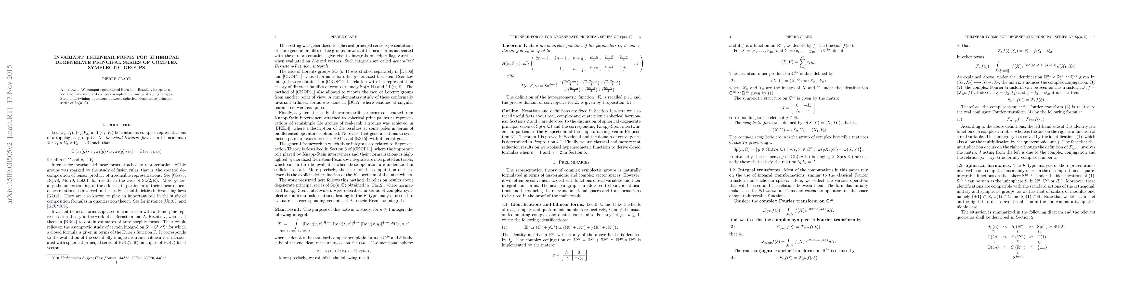 Summary: This paper computes generalized Bernstein-Reznikov integrals for spherical degenerate principal series of complex symplectic groups through the analysis of Knapp-Stein intertwining operators. The study reveals invariant trilinear forms associated with these series.