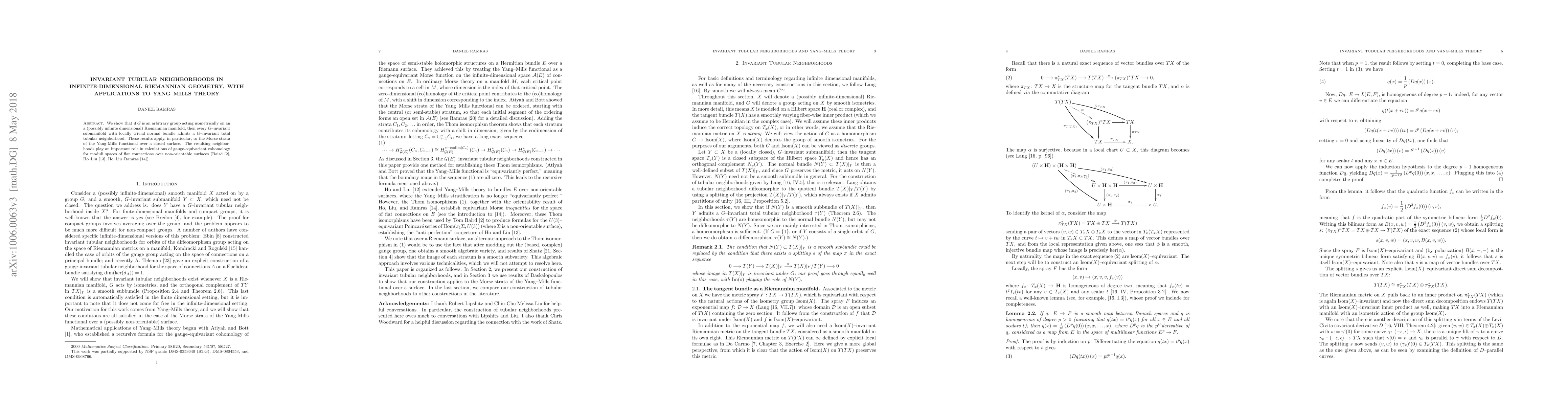 Summary: This paper constructs G-invariant tubular neighborhoods for G-invariant submanifolds in infinite-dimensional Riemannian manifolds, and applies this to Yang-Mills theory, aiding calculations of gauge-equivariant cohomology for moduli spaces of flat connections over non-orientable surfaces.